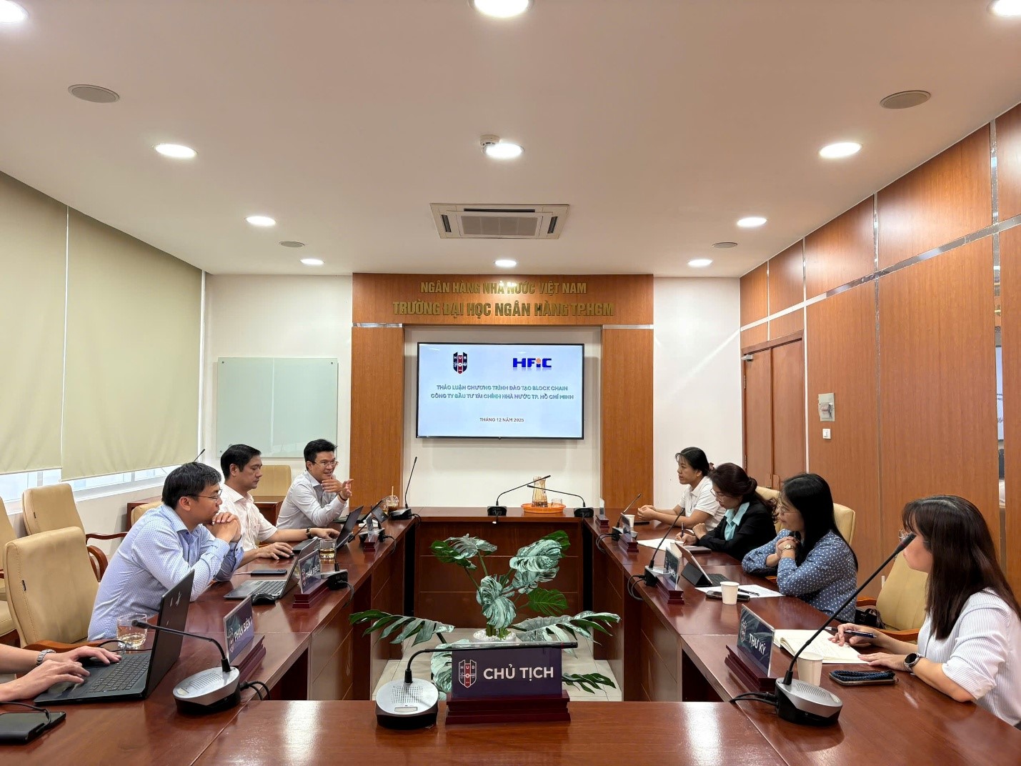 Ngày 11/12/2025, Trường Đại học Ngân hàng TP.HCM (HUB) và Công ty Đầu tư Tài chính Nhà nước TP.HCM (HFIC) đã có buổi làm việc với nhau nhằm trao đổi và thống nhất định hướng xây dựng chương trình đào tạo chuyên sâu về Blockchain dành cho đội ngũ nhân sự HFIC.