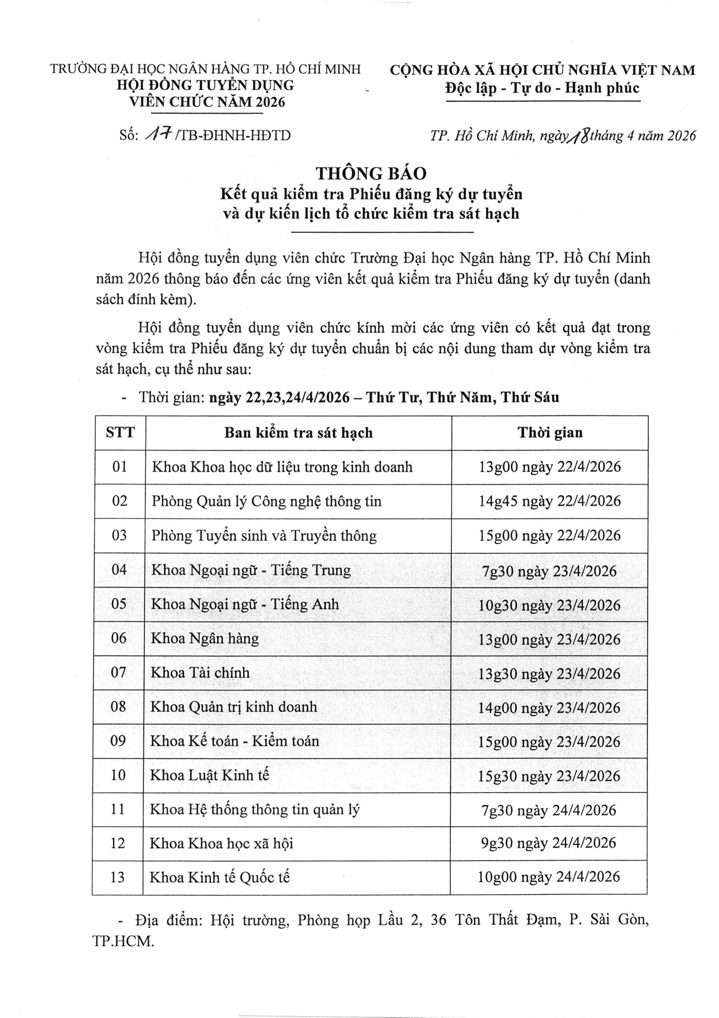 Thông báo Kết quả kiểm tra Phiếu đăng ký dự tuyển và dự kiến lịch tổ chức kiểm tra sát hạch