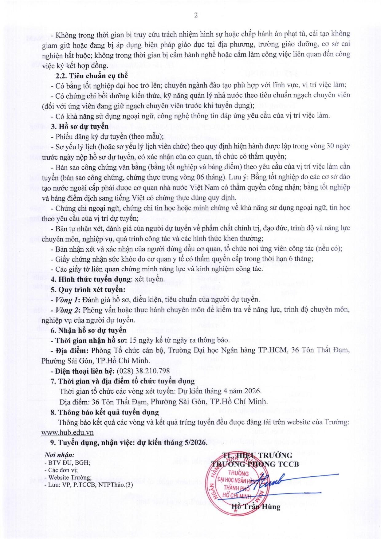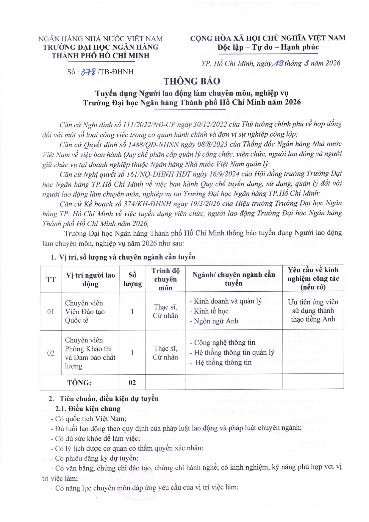 Thông báo Tuyển dụng Người lao động làm chuyên môn, nghiệp vụ Trường Đại học Ngân hàng TP.HCM năm 2026