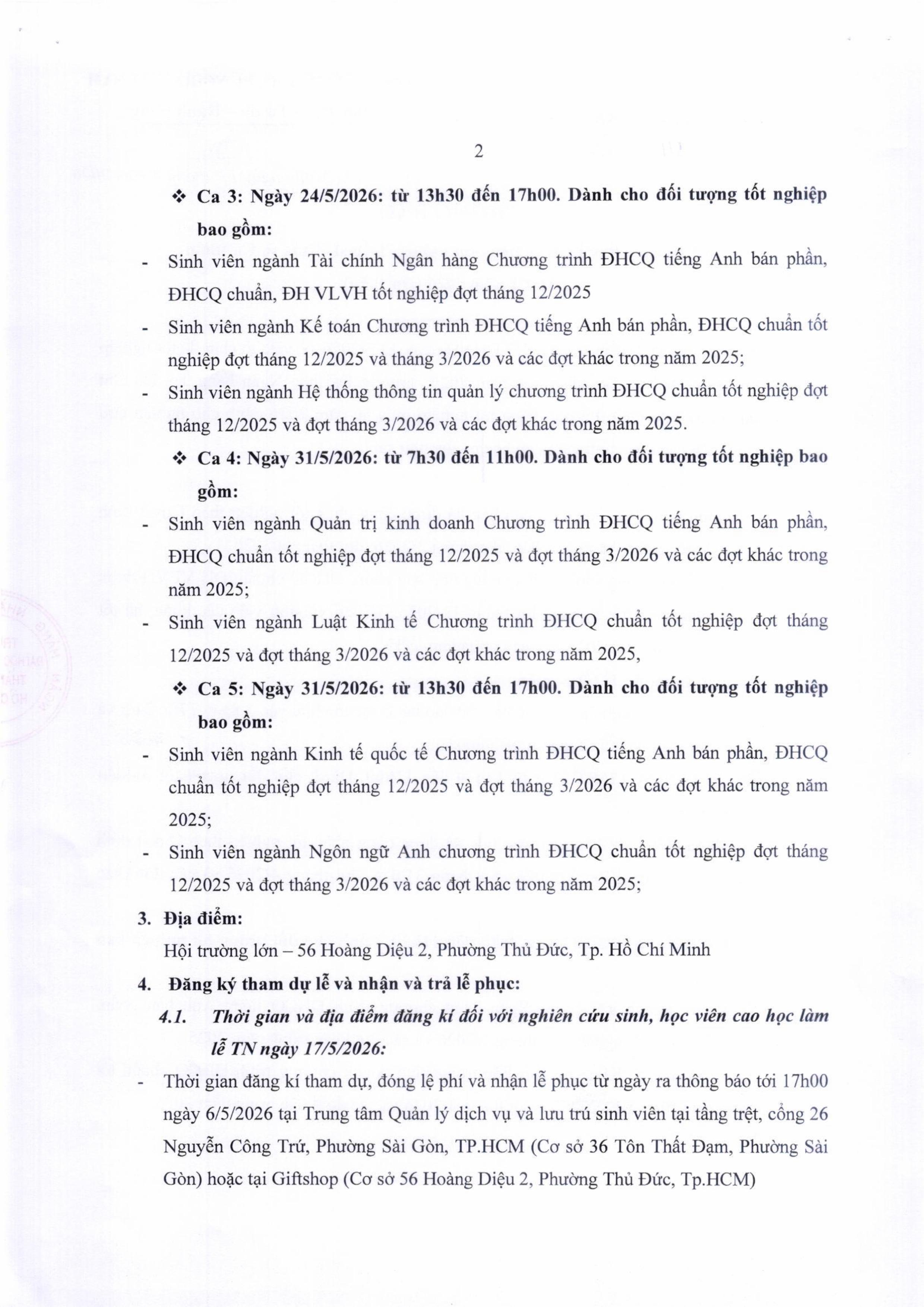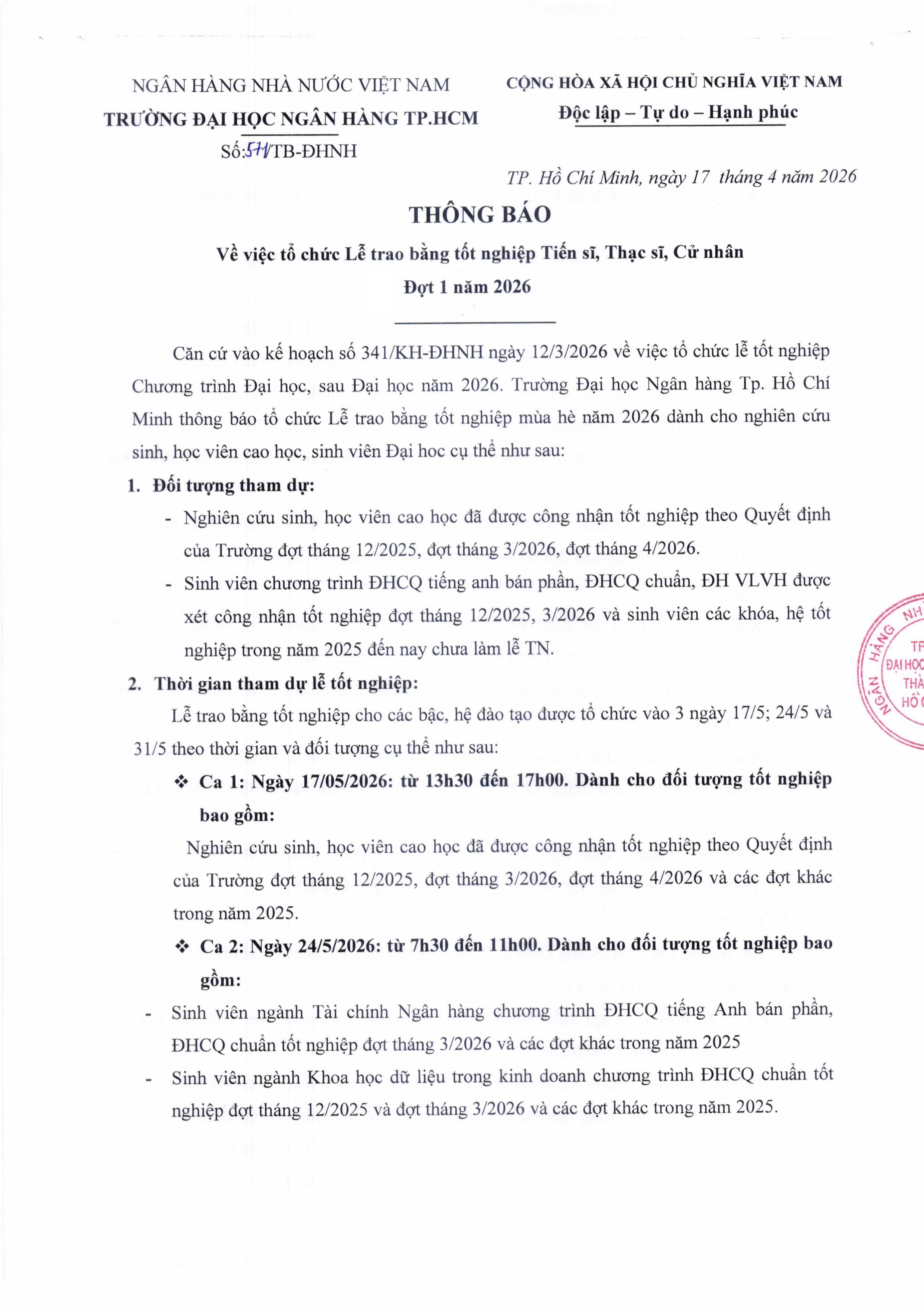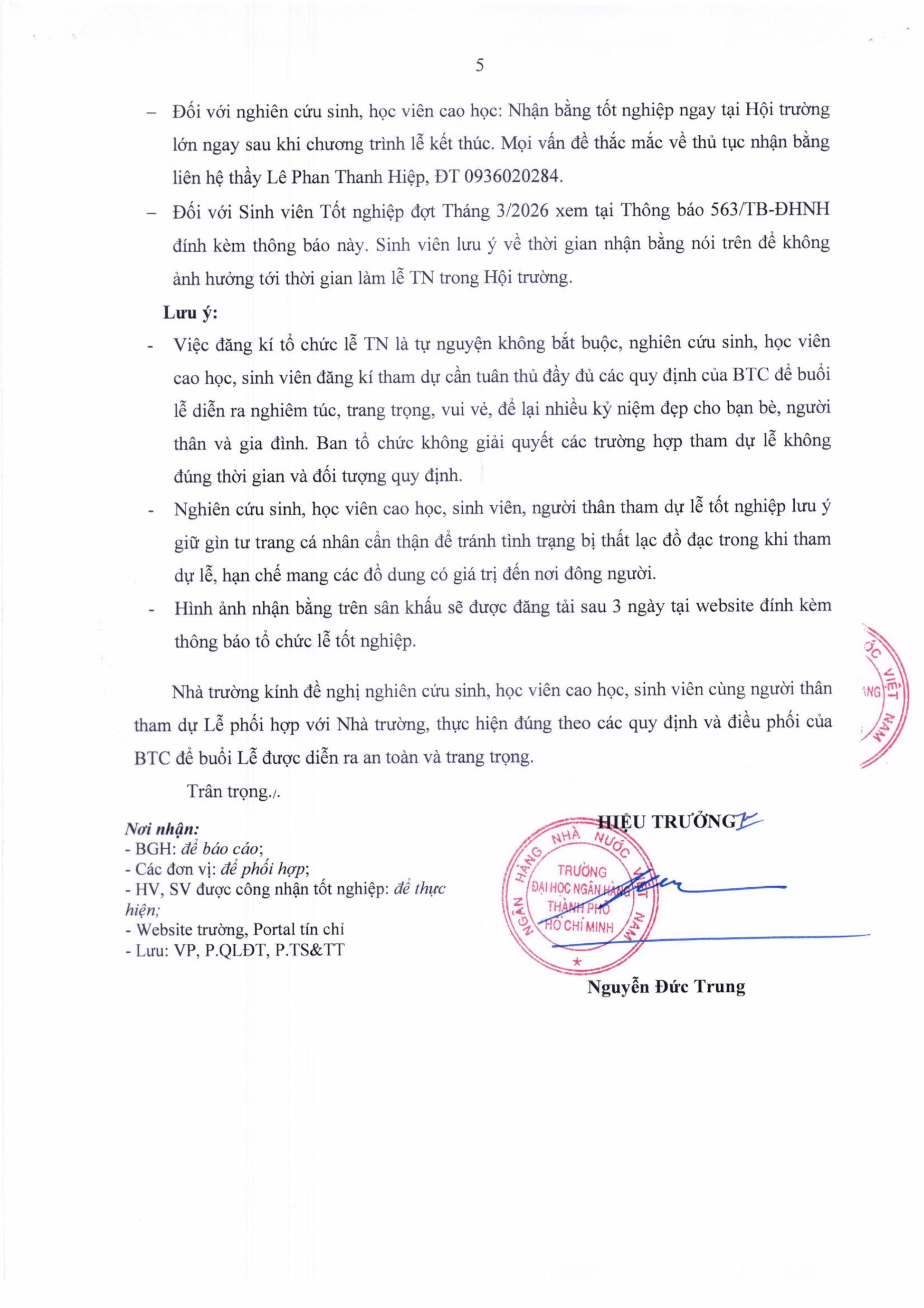 Thông báo v/v tổ chức Lễ trao bằng tốt nghiệp Tiến sĩ, Thạc sĩ, Cử nhân Đợt 1 năm 2026