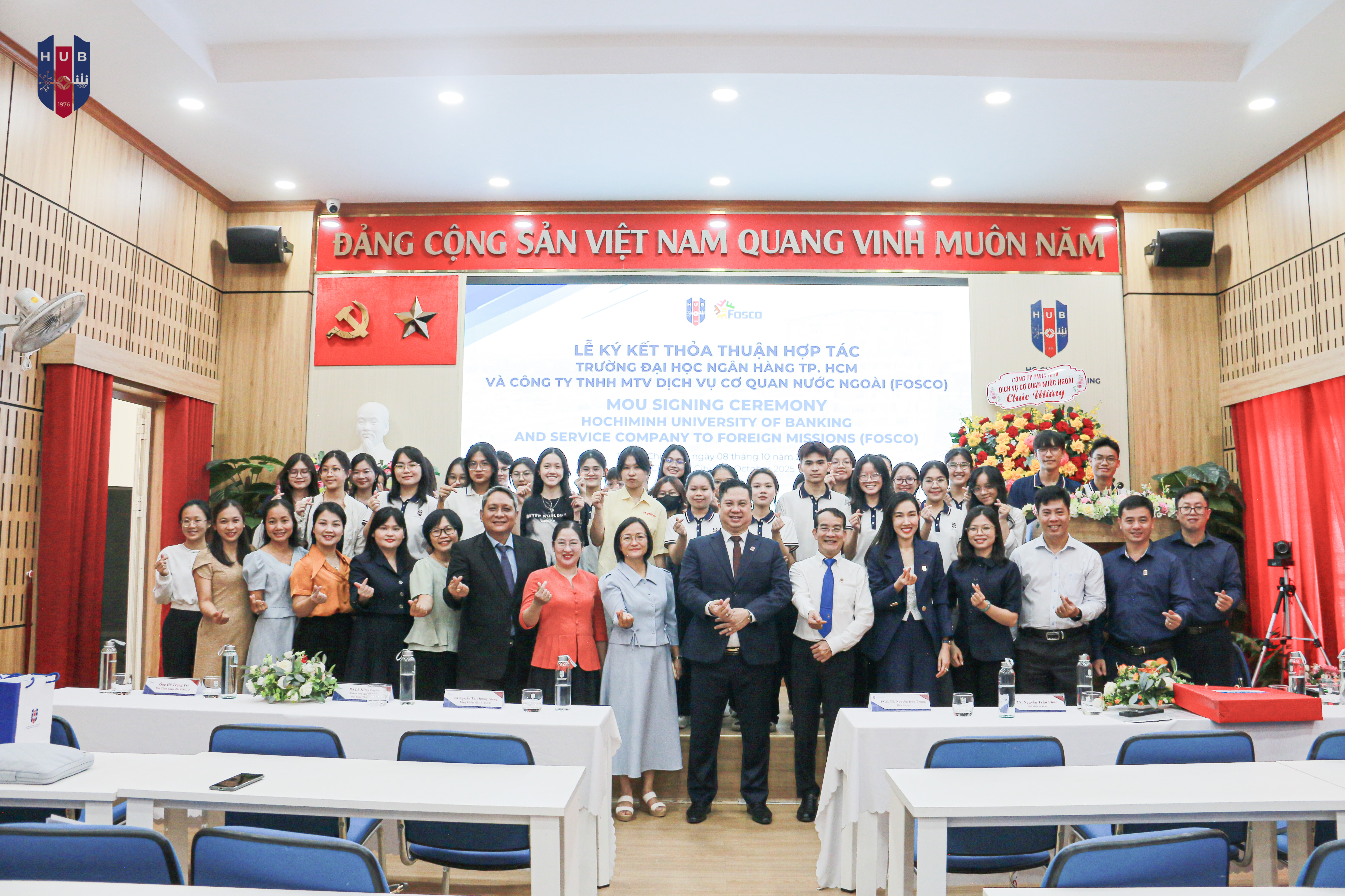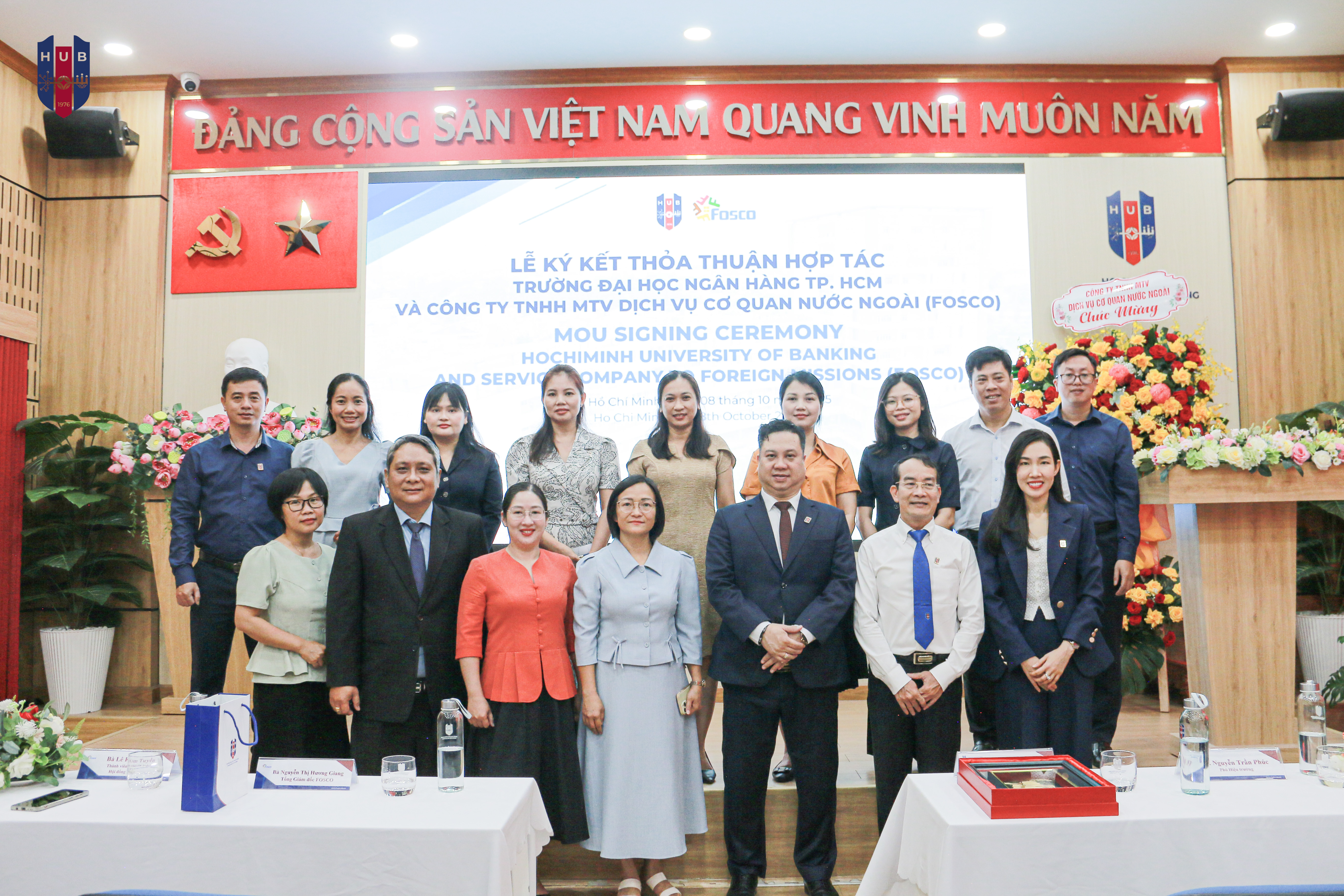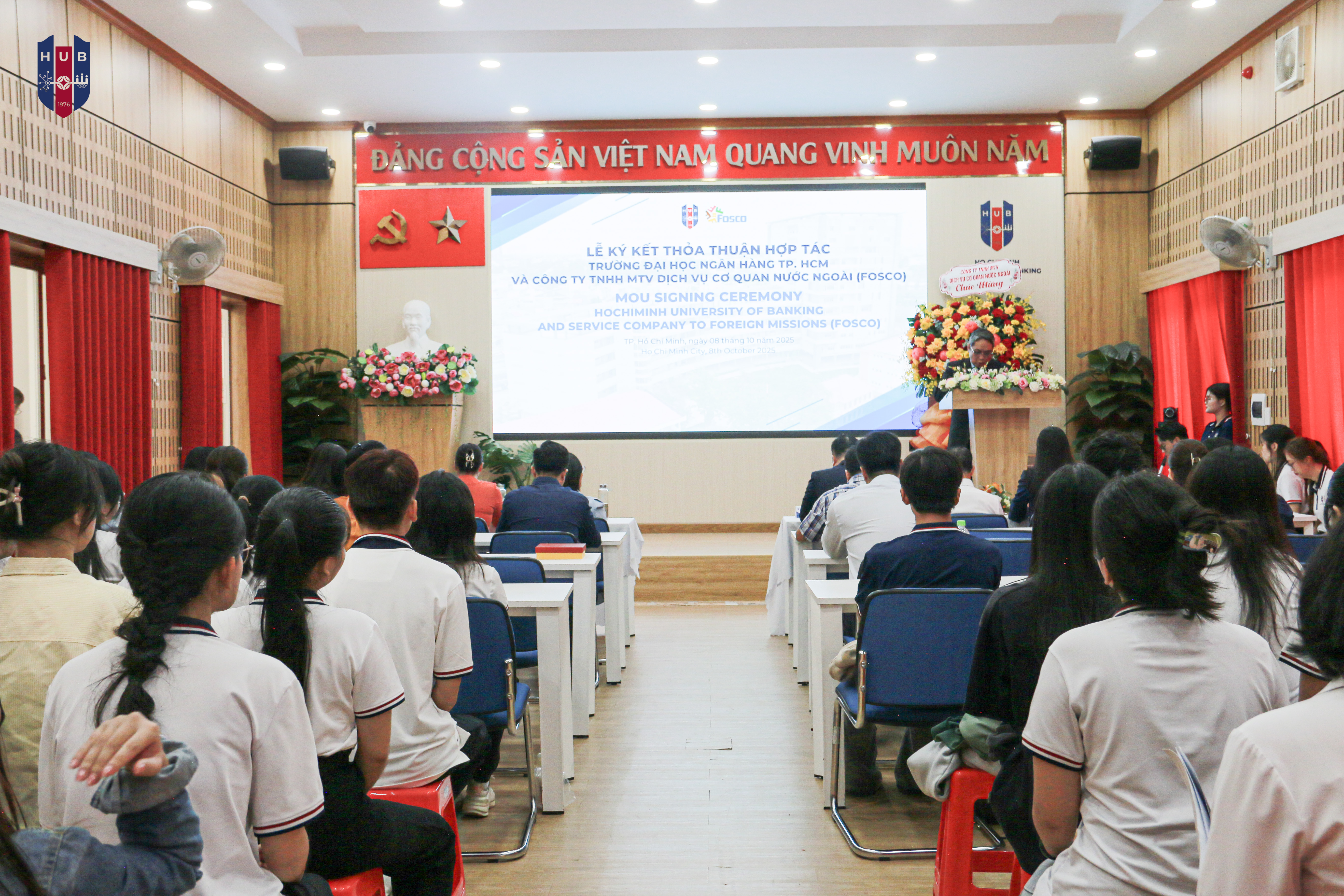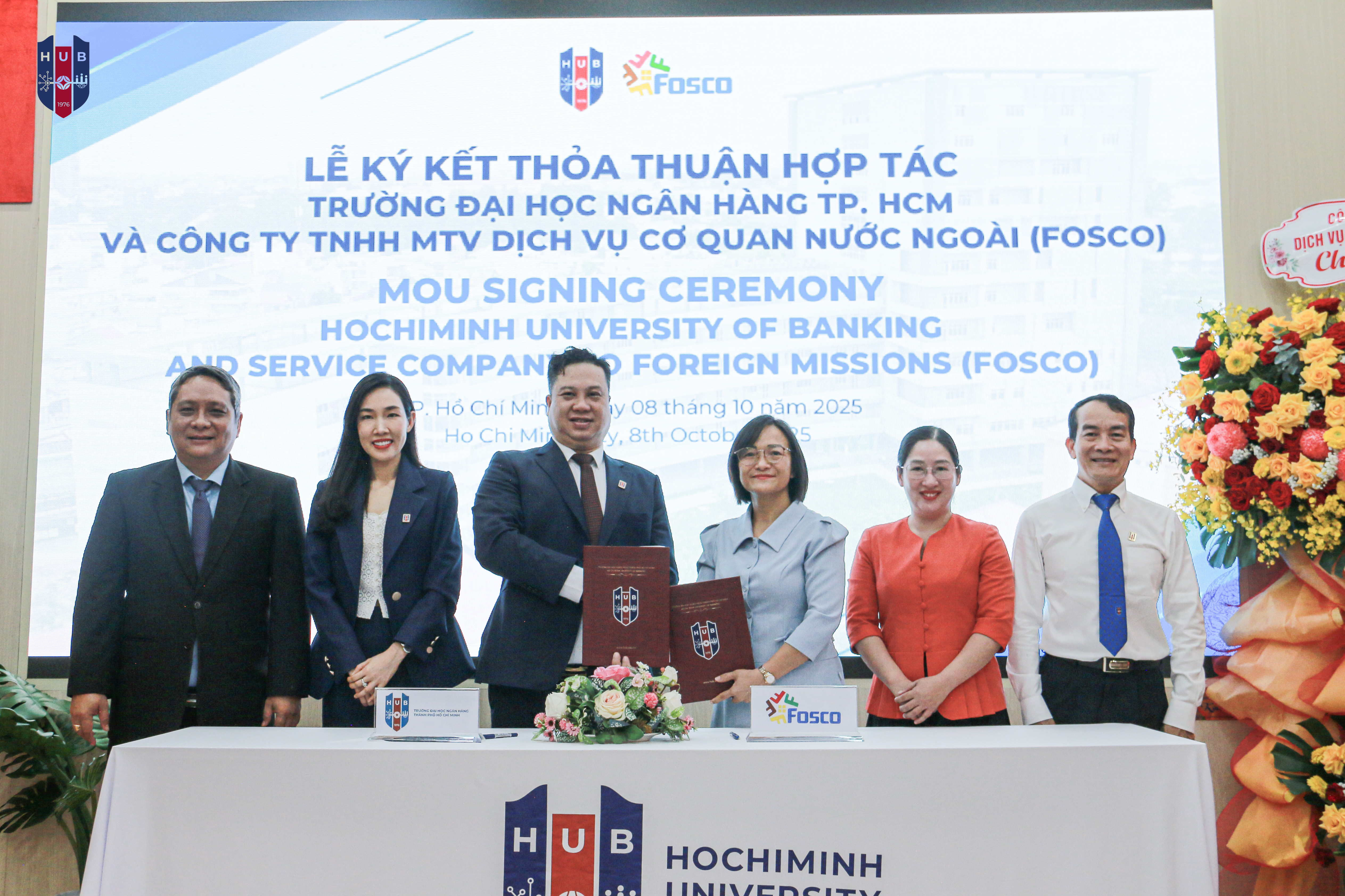 Sáng ngày 08/10/2025, Trường Đại học Ngân hàng TP.HCM (HUB) đã tổ chức Lễ ký kết thỏa thuận hợp tác với Công ty TNHH MTV Dịch vụ Cơ quan Nước ngoài (FOSCO). Sự kiện đánh dấu mốc hợp tác quan trọng, hứa hẹn mang đến nhiều cơ hội phát triển nghề nghiệp, thực tập và giao lưu quốc tế cho sinh viên HUB.