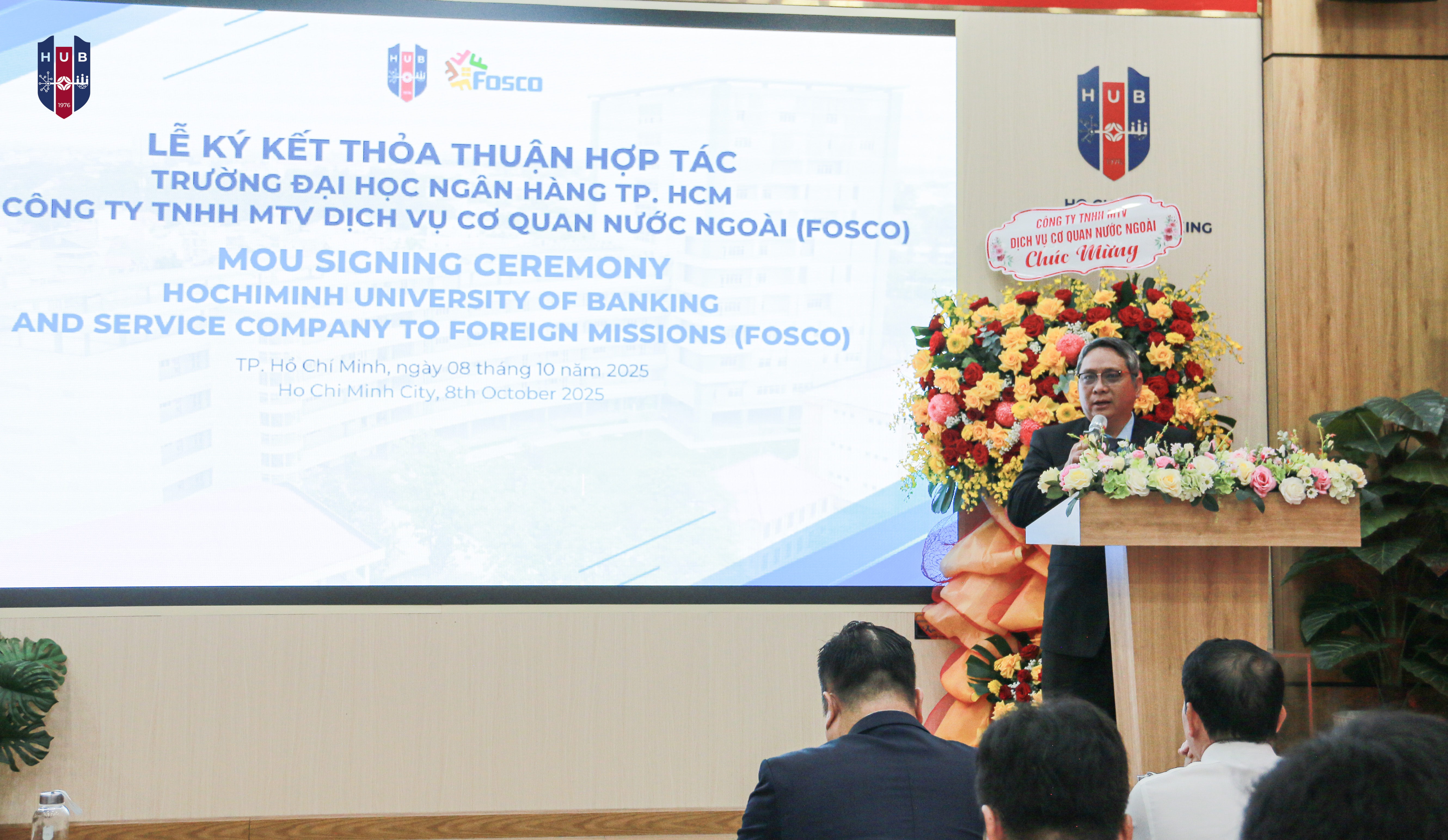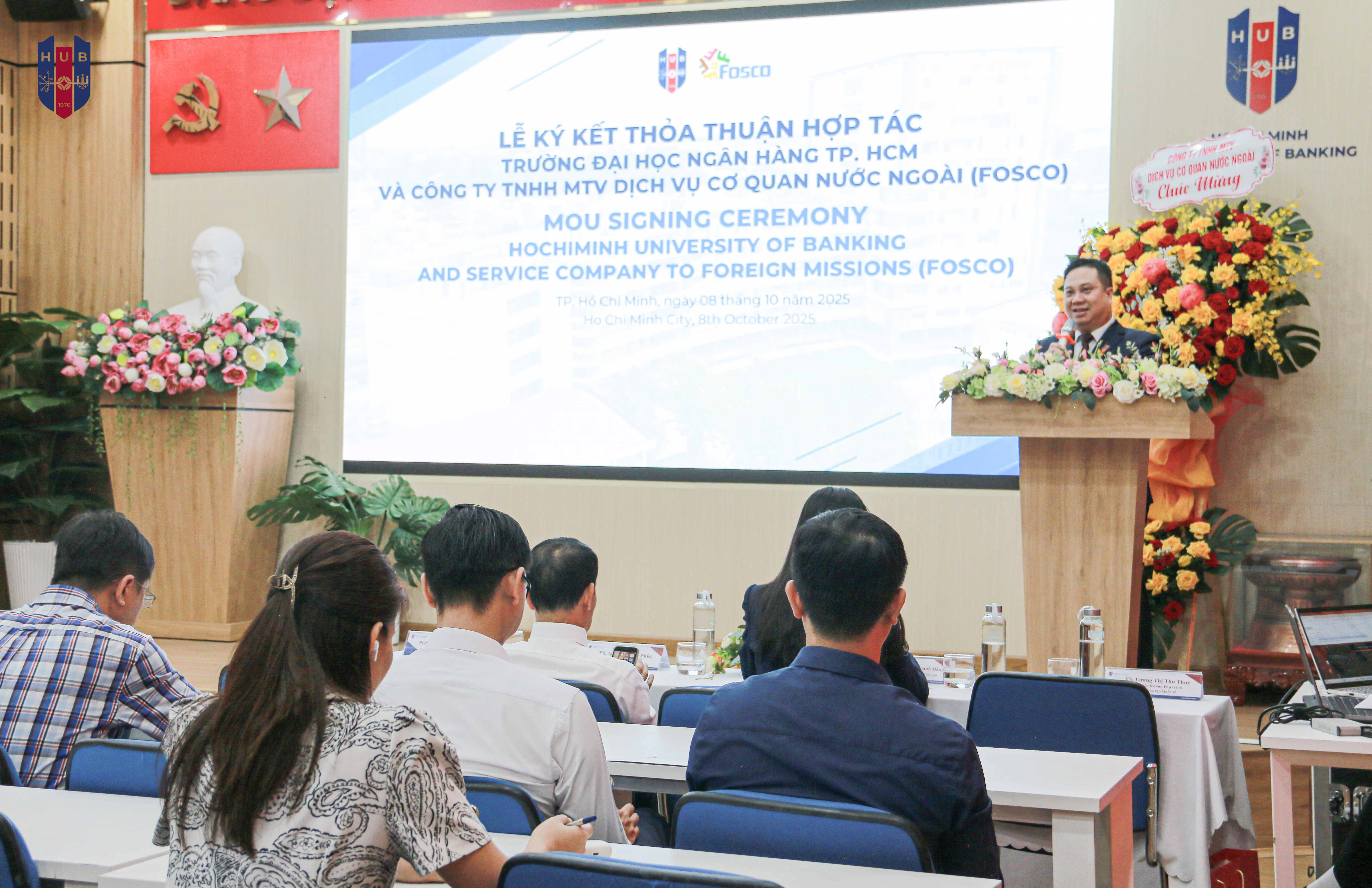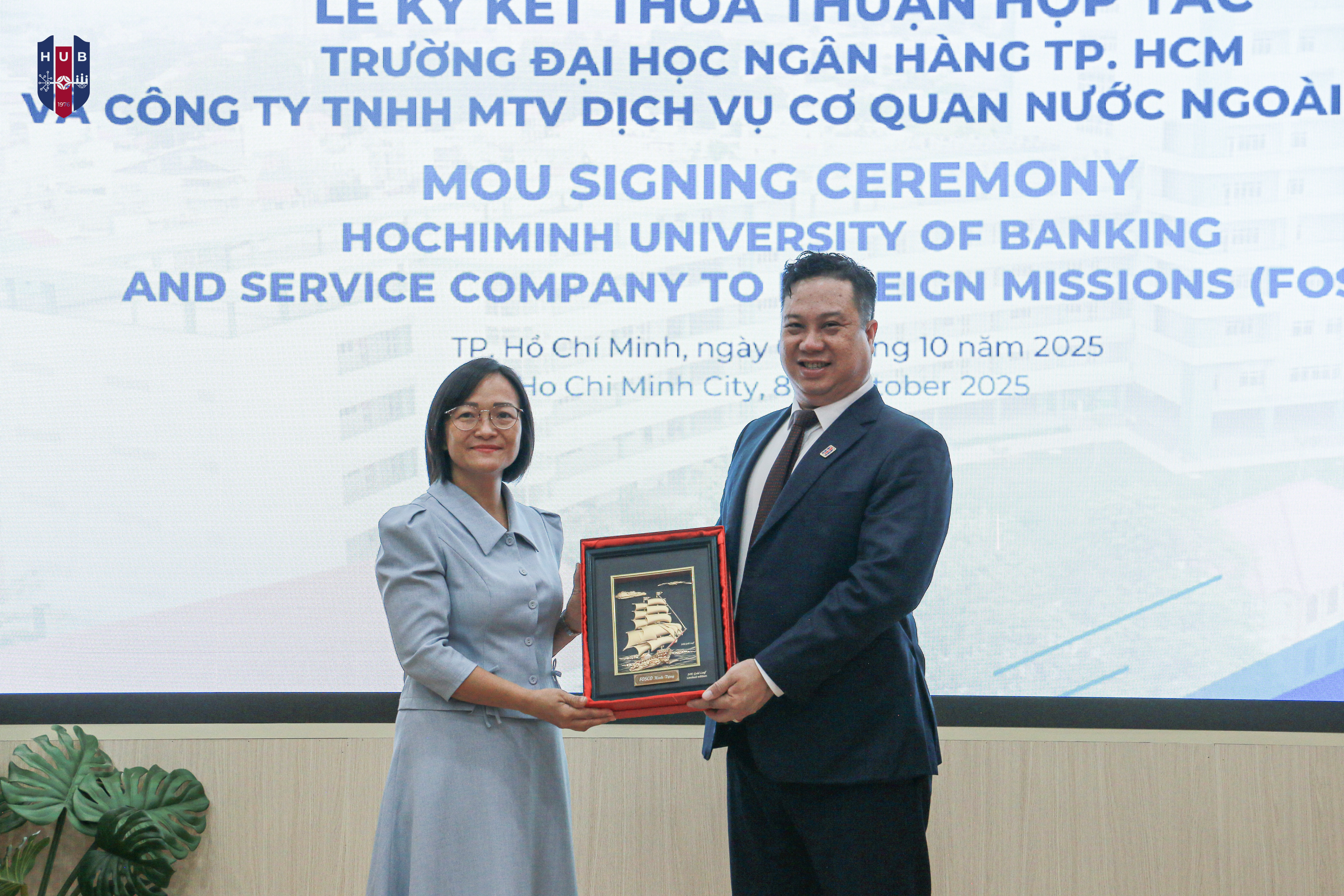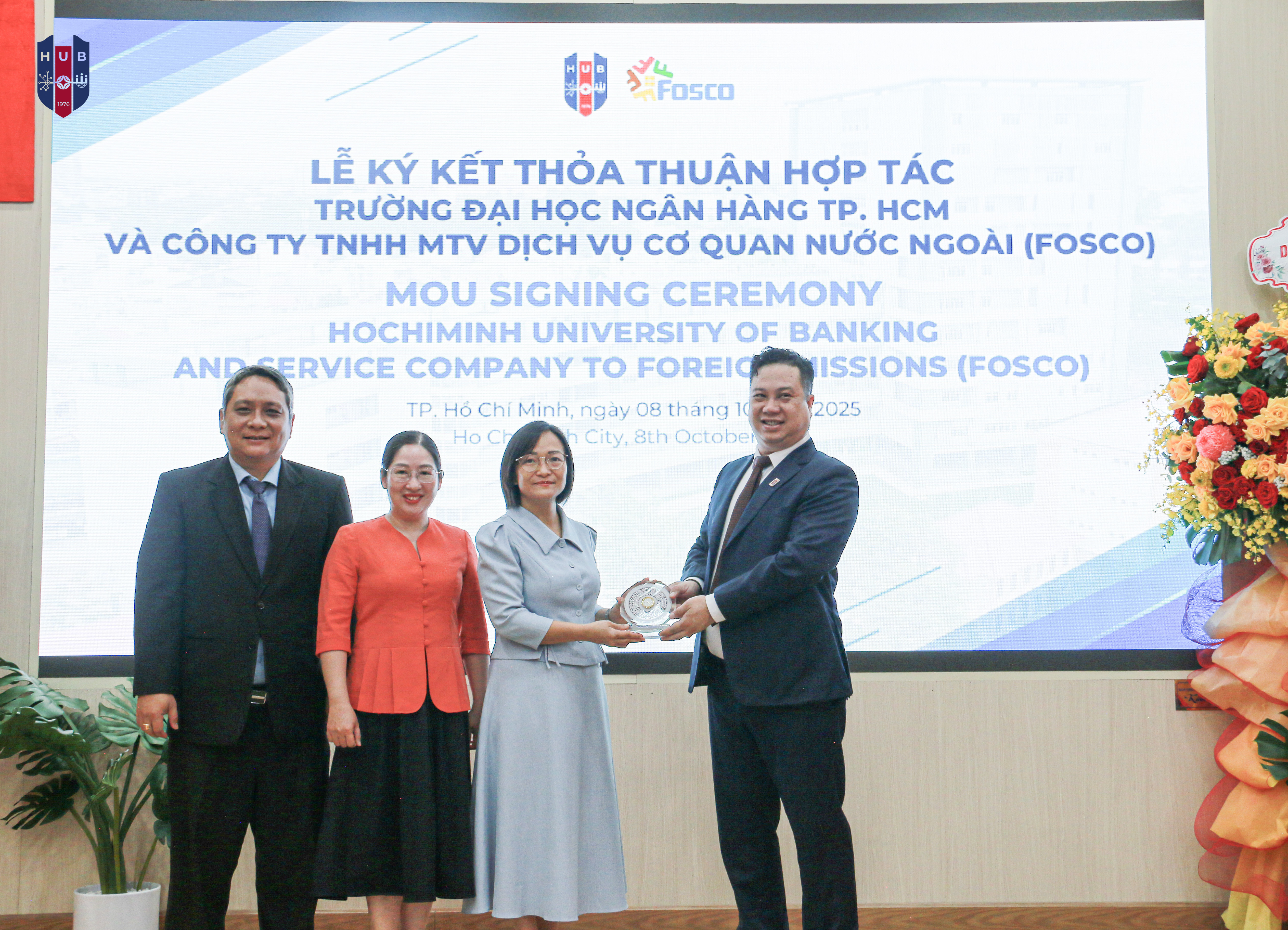 Sáng ngày 08/10/2025, Trường Đại học Ngân hàng TP.HCM (HUB) đã tổ chức Lễ ký kết thỏa thuận hợp tác với Công ty TNHH MTV Dịch vụ Cơ quan Nước ngoài (FOSCO). Sự kiện đánh dấu mốc hợp tác quan trọng, hứa hẹn mang đến nhiều cơ hội phát triển nghề nghiệp, thực tập và giao lưu quốc tế cho sinh viên HUB.