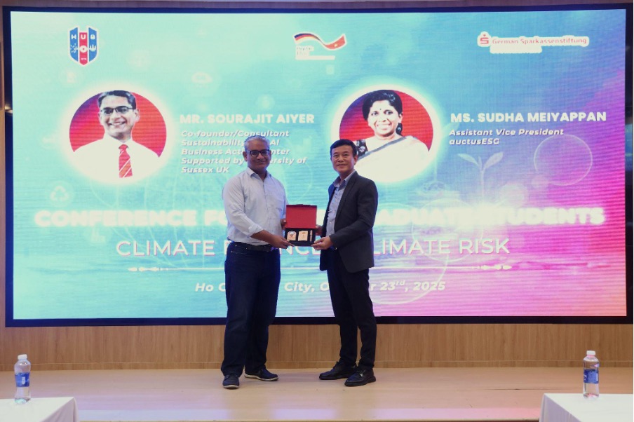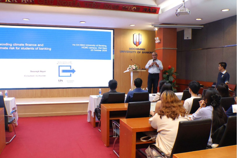 Sáng ngày 23/10/2025, tại Trường Đại học Ngân hàng TP.HCM (HUB), Viện Đào tạo Quốc tế (SaigonISB) đã tổ chức thành công buổi tọa đàm thuộc chuỗi SaigonISB Talks hướng đến việc nâng cao nhận thức về phát triển bền vững, với chủ đề “Decoding Climate Finance and Climate Risk” (Tạm dịch: Giải mã tài chính khí hậu và rủi ro khí hậu), phối hợp cùng Quỹ Tiết kiệm các Ngân hàng Đức (Deutsche Sparkassenstiftung für internationale Kooperation - DSIK).