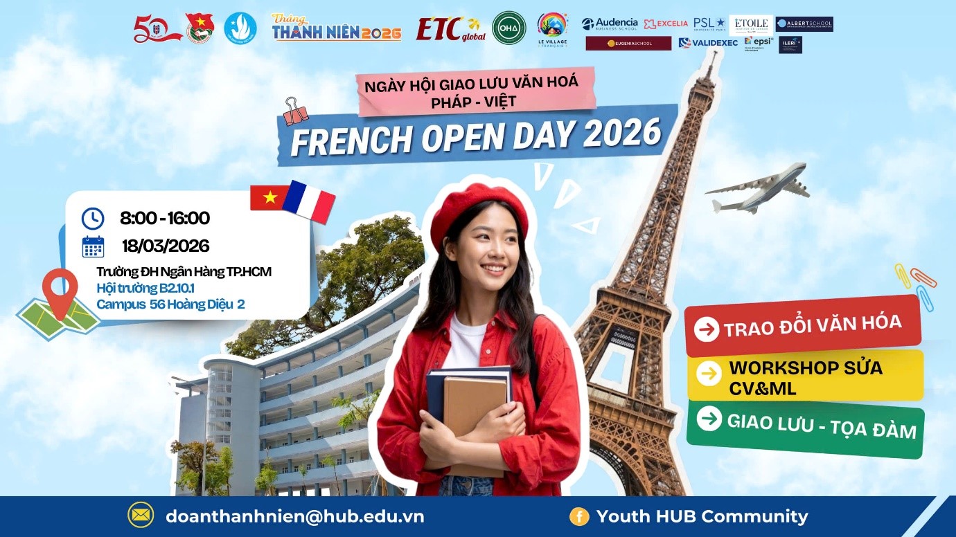 Ngày 18/03/2026, Đoàn Thanh niên Trường Đại học Ngân hàng TP. Hồ Chí Minh (HUB) phối hợp tổ chức sự kiện French Open Day 2026 tại cơ sở 56 Hoàng Diệu 2, P. Thủ Đức. Chương trình mang đến không gian giao lưu trải nghiệm văn hóa Pháp dành cho học sinh, sinh viên; đồng thời các chuyên gia sẽ trực tiếp tư vấn về lộ trình, về ngành nghề và cơ hội học tập và phát triển nghề nghiệp trong môi trường quốc tế.