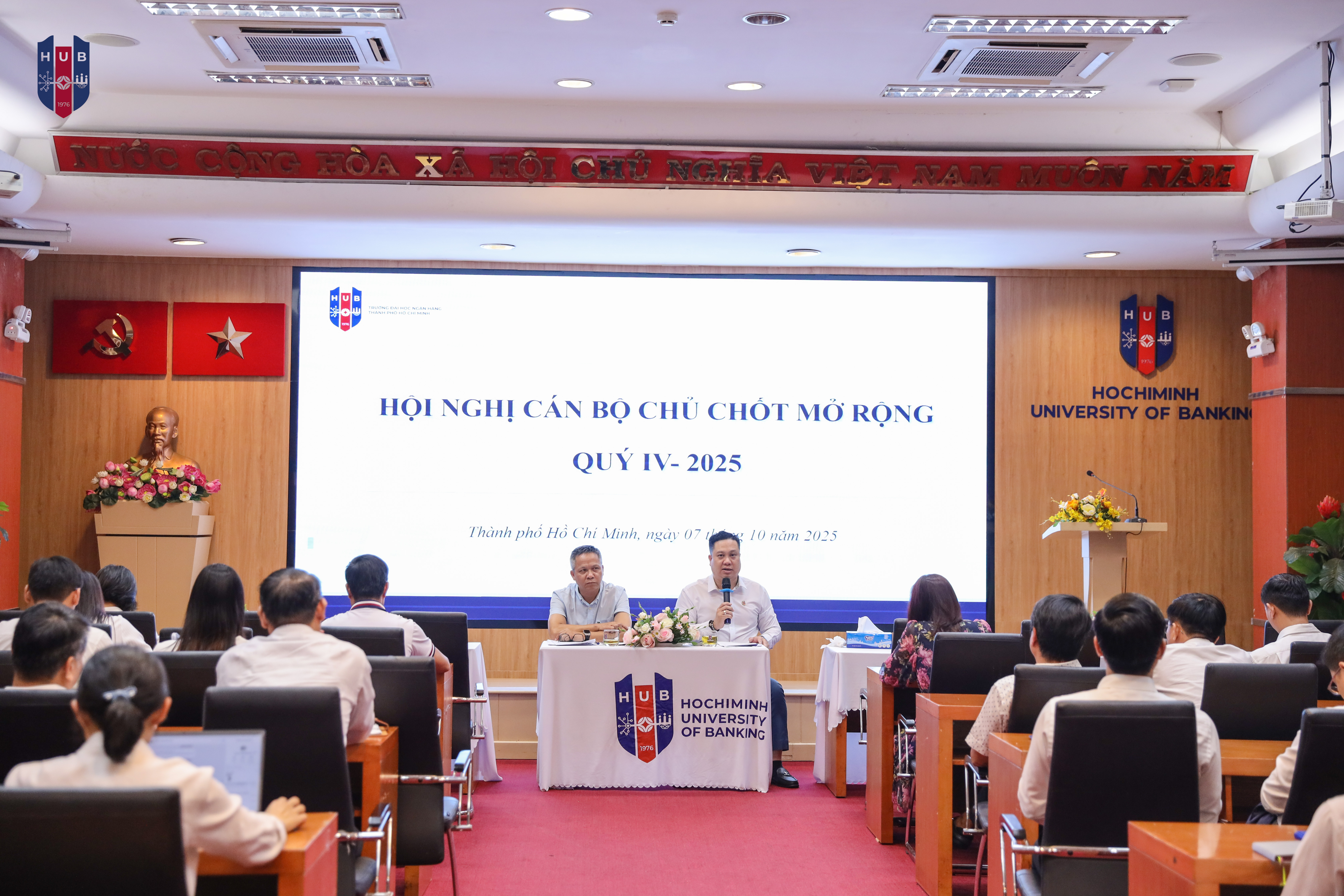 Chiều ngày 07/10/2025, tại Hội trường 36 Tôn Thất Đạm, Trường Đại học Ngân hàng TP. Hồ Chí Minh (HUB) đã tổ chức Cuộc họp cán bộ chủ chốt mở rộng quý IV/2025 nhằm đánh giá kết quả thực hiện nhiệm vụ thời gian qua và đề ra phương hướng, nhiệm vụ trọng tâm trong giai đoạn cuối năm 2025.