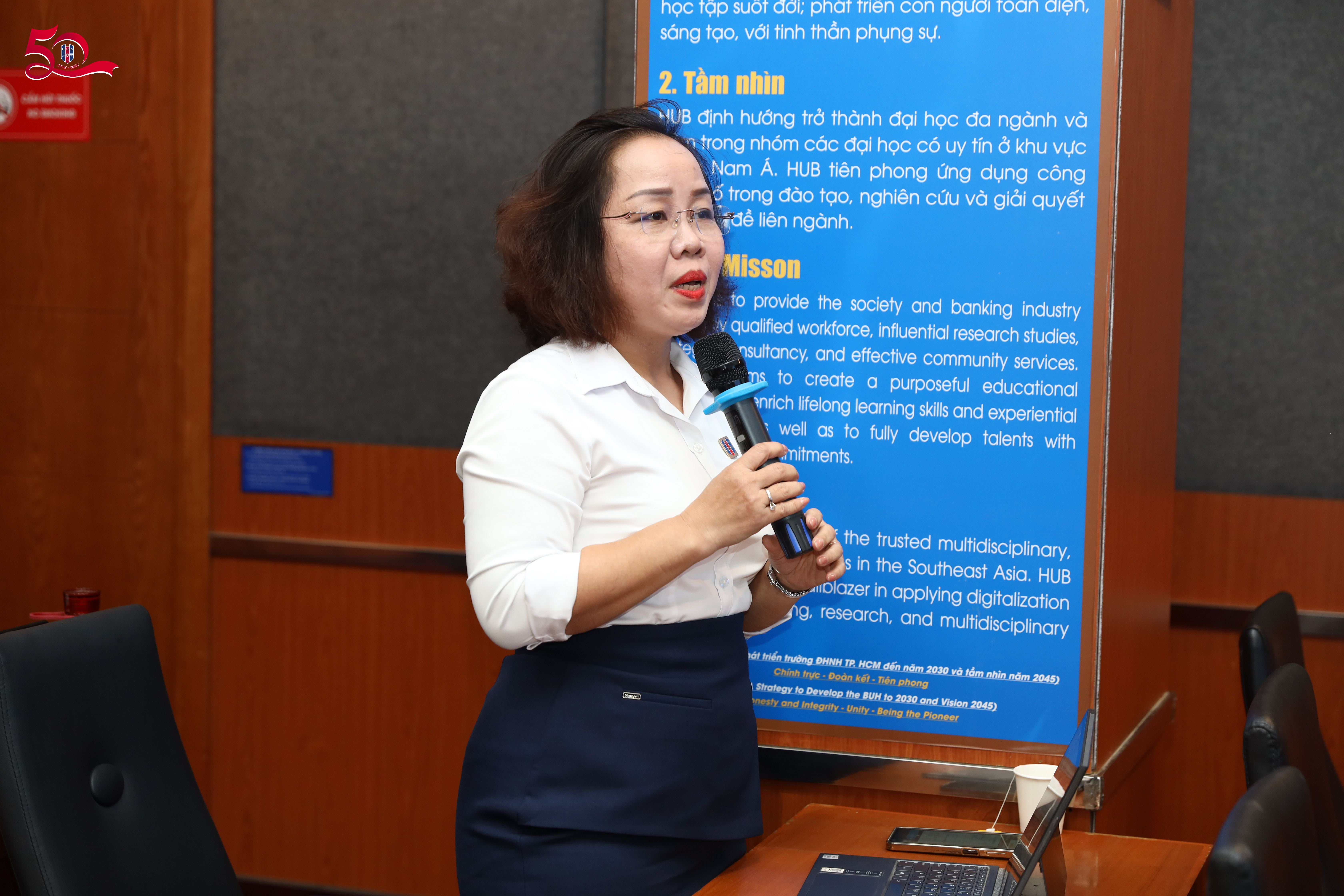 ThS. Hoàng Thị Tuyền- Phó Giám đốc điều hành Trung tâm sinh viên và quan hệ doanh nghiệp đọc báo cáo tổng kết công tác kết nối và phục vụ cộng đồng Giai đoạn 2021-2025