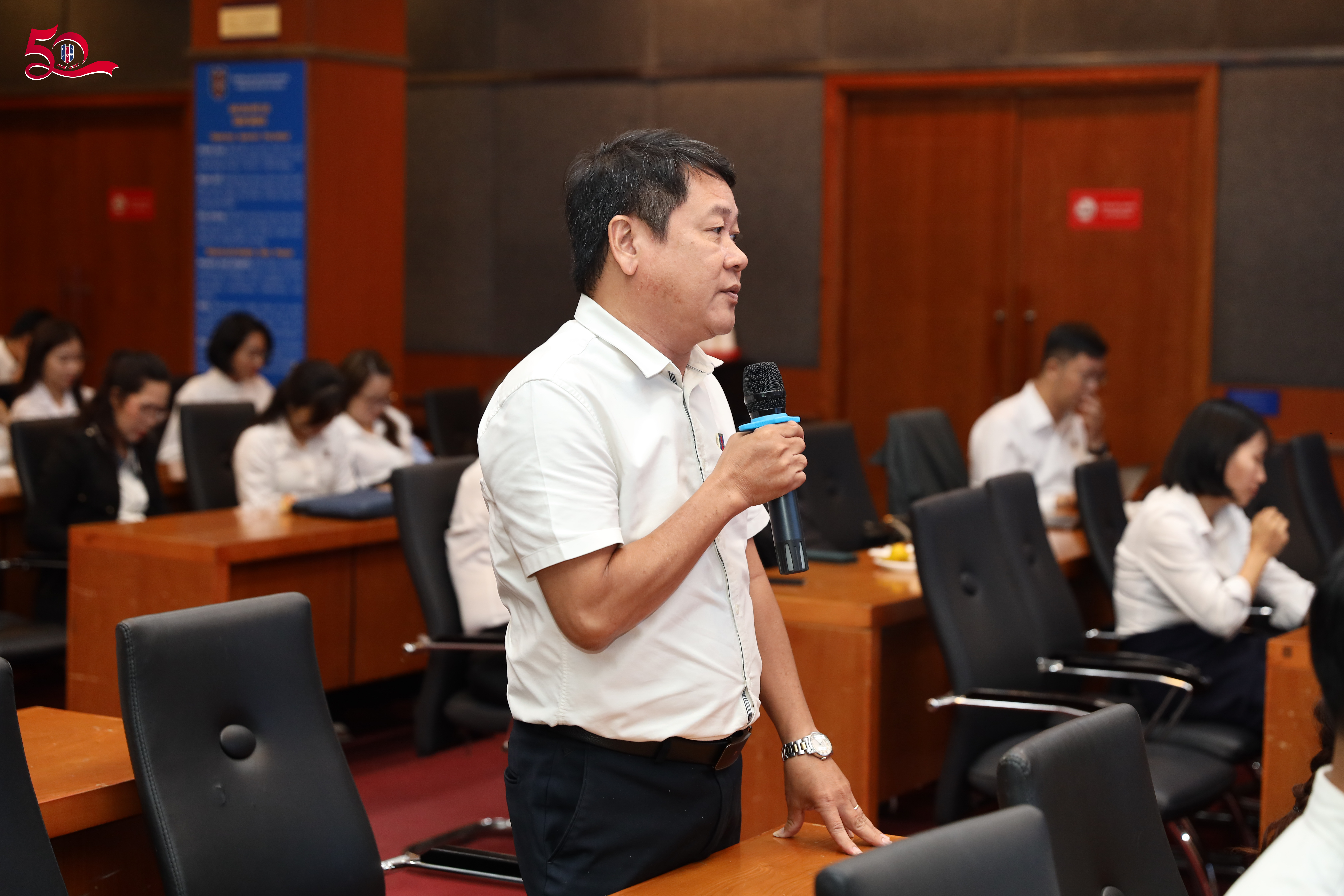 Tham dự hội nghị có GS.TS. Nguyễn Đức Trung- Hiệu trưởng Nhà trường; TS. Nguyễn Trần Phúc - Phó Hiệu trưởng thường trực cùng lãnh đạo các đơn vị và các cán bộ, giảng viên, viên chức được khen thưởng trong công tác kết nối và phục vụ cộng đồng giai đoạn 2021–2025.