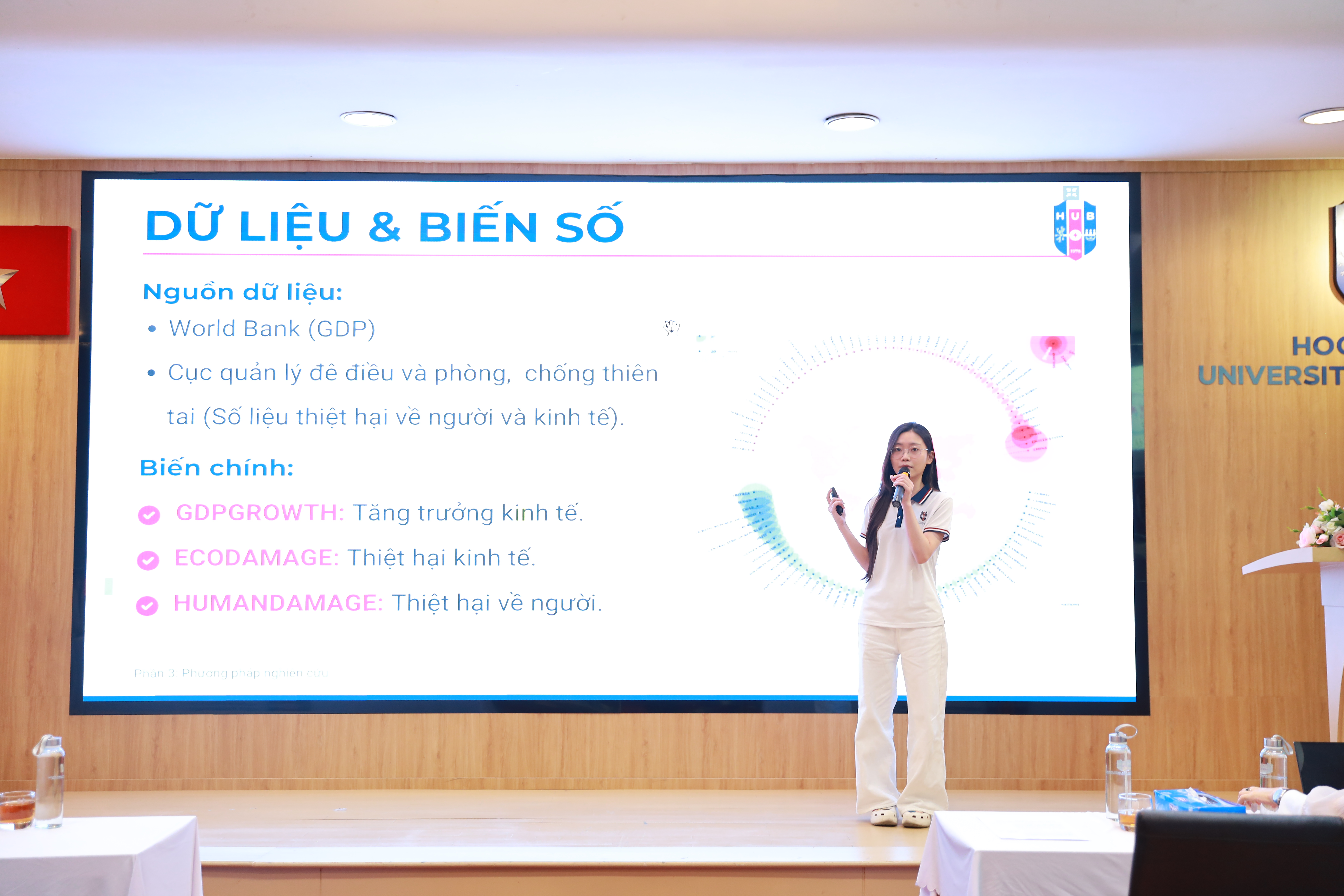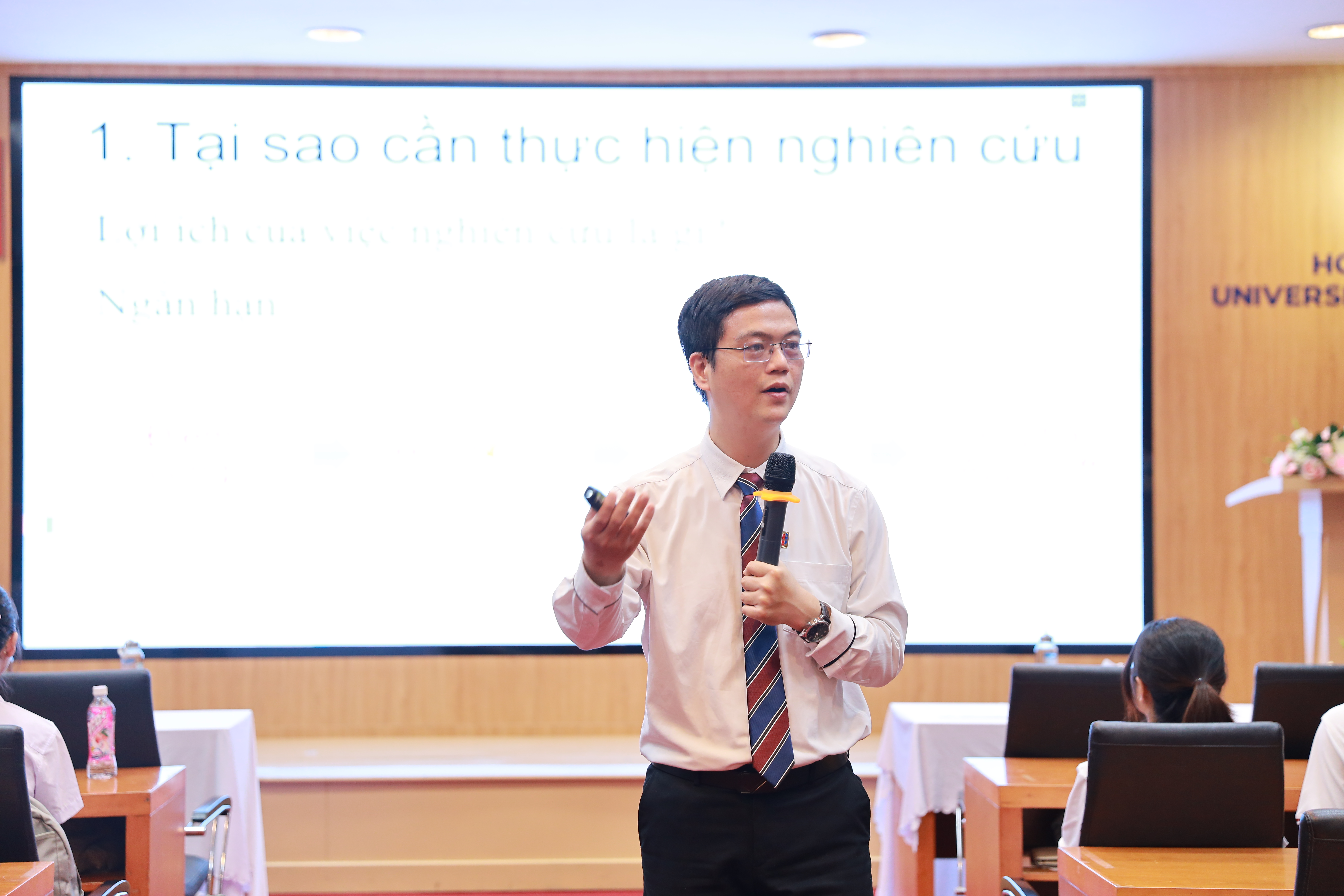 Bên cạnh đó, diễn giả cũng nhấn mạnh vai trò của nghiên cứu trong việc rèn luyện tư duy logic, tư duy phản biện và tư duy sáng tạo, giúp sinh viên từng bước hình thành phương pháp tiếp cận vấn đề khoa học, từ ý tưởng đến xây dựng mô hình, xử lý dữ liệu và tạo ra kết quả có giá trị thực tiễn. Đây chính là nền tảng quan trọng để sinh viên HUB chủ động thích nghi với môi trường học tập và làm việc trong bối cảnh chuyển đổi số hiện nay.