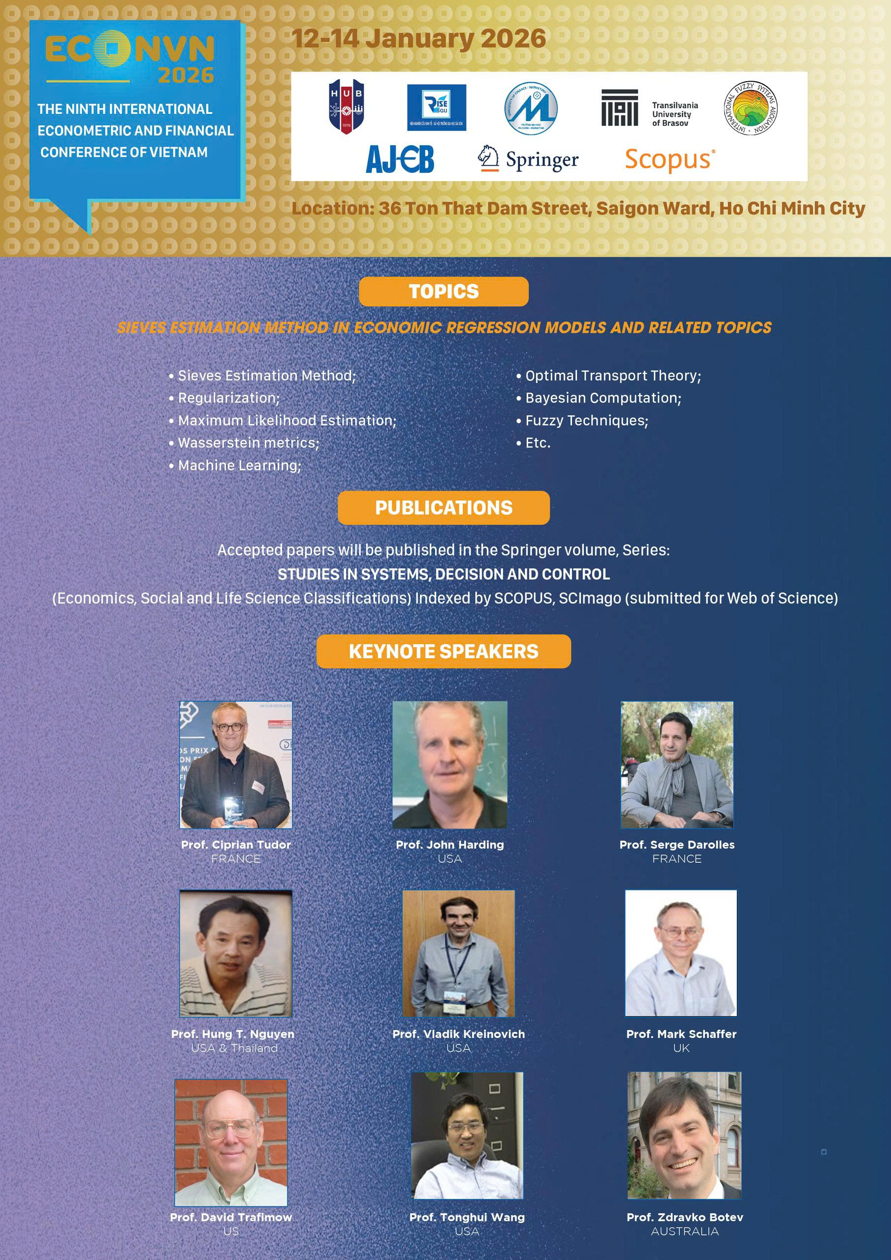 (Phương pháp ước lượng Sieves trong các mô hình hồi quy kinh tế và các chủ đề liên quan). ECONVN2026 là hội thảo khoa học quốc tế do Trường Đại học Ngân hàng Thành phố Hồ Chí Minh chủ trì tổ chức; trong đó Tạp chí Kinh tế và Ngân hàng châu Á (Asian Journal of Economics and Banking) là đơn vị đầu mối tổ chức ECONVN của Nhà trường. Bên cạnh Nhà xuất bản Springer và Tạp chí Kinh tế và Ngân hàng châu Á là các đơn vị phối hợp xuất bản Kỷ yếu Hội thảo ECONVN theo thông lệ hằng năm, ECONVN2026 còn có sự tham gia của nhiều đối tác đào tạo và học thuật uy tín, bao gồm: Đại học Transilvania của Brașov (Romania), Trường Đại học Tài chính – Marketing, Viện Nghiên cứu Kinh tế – Xã hội thuộc Trường Đại học Sài Gòn, và Hiệp hội Hệ thống Fuzzy Quốc tế (International Fuzzy Systems Association – IFSA).