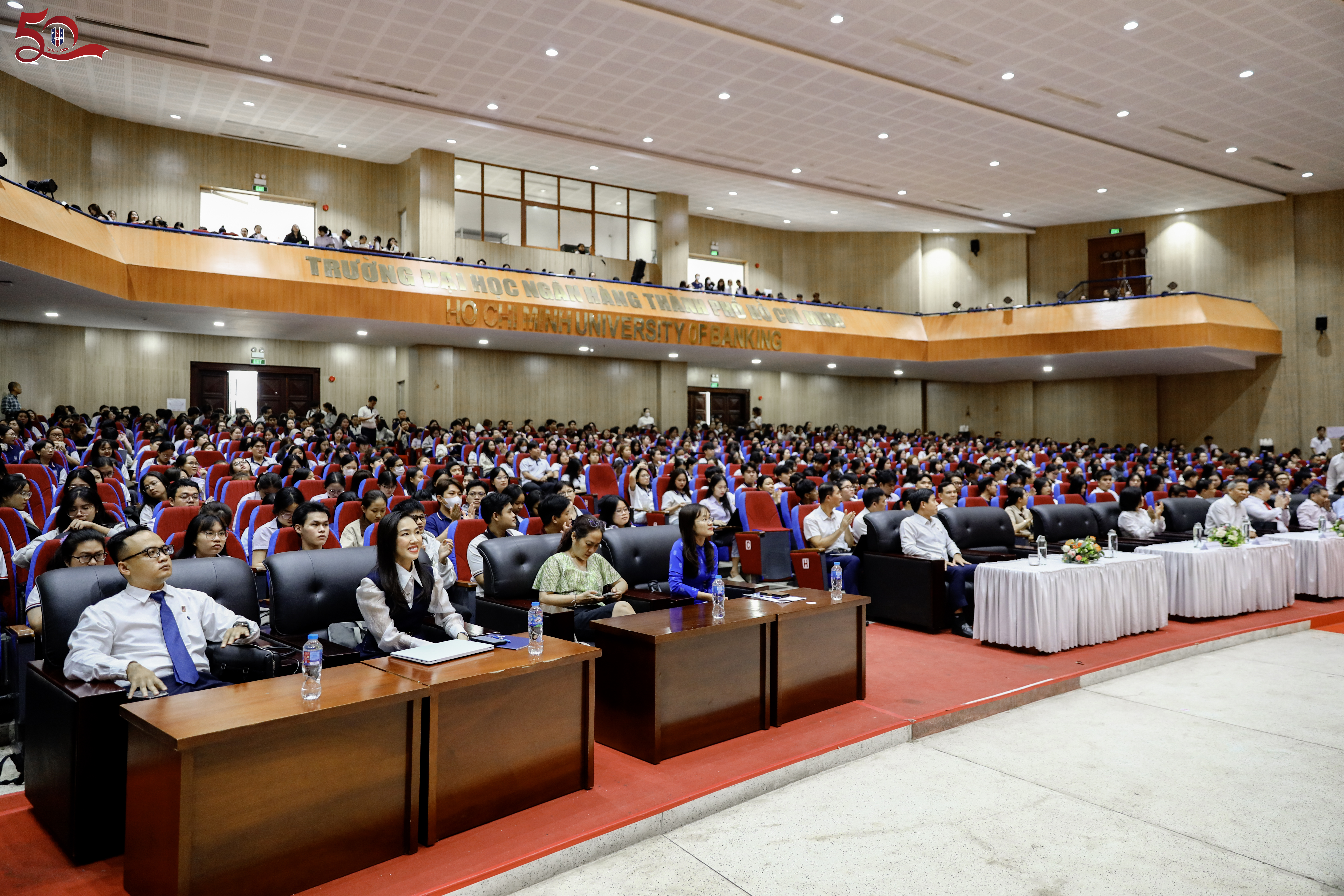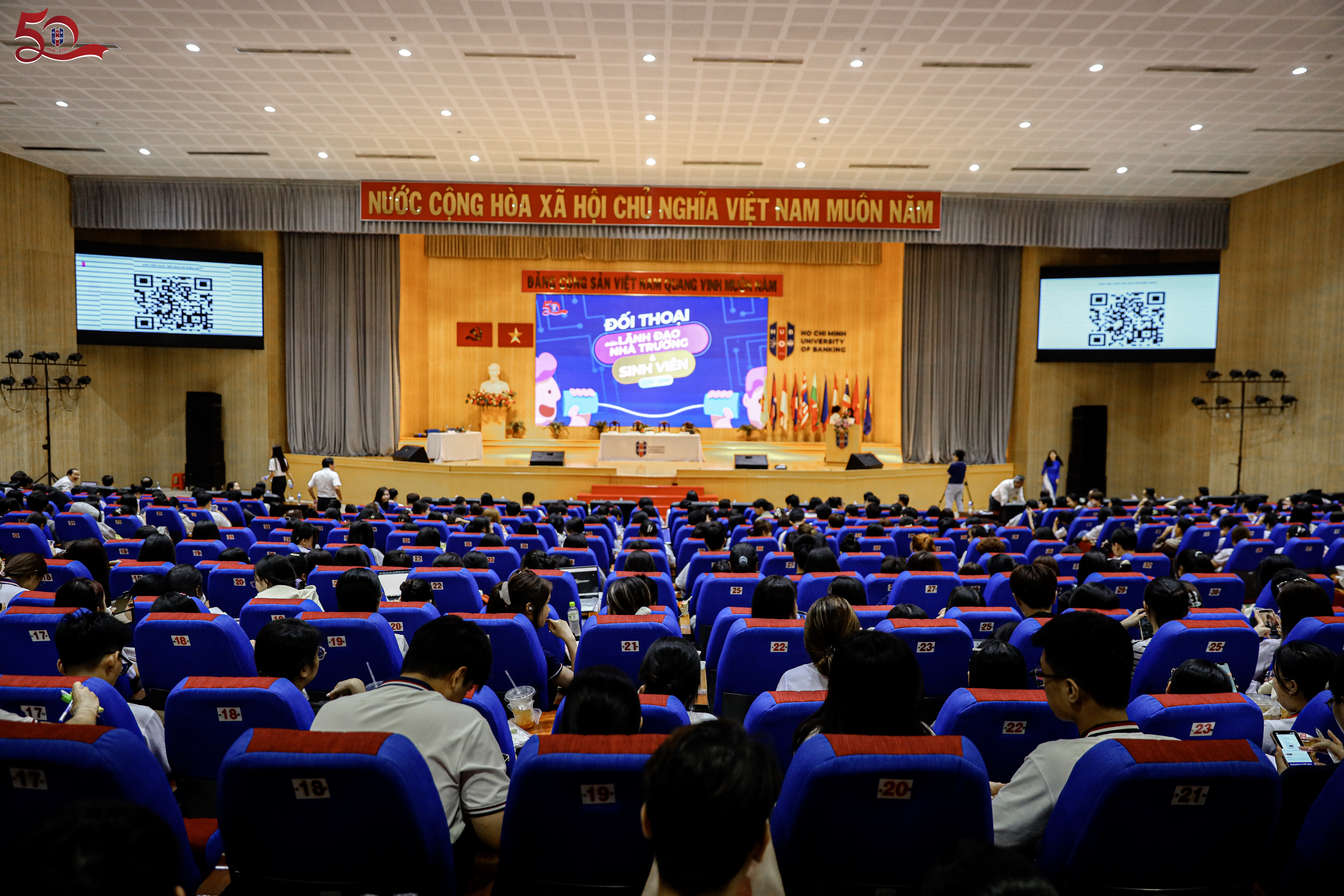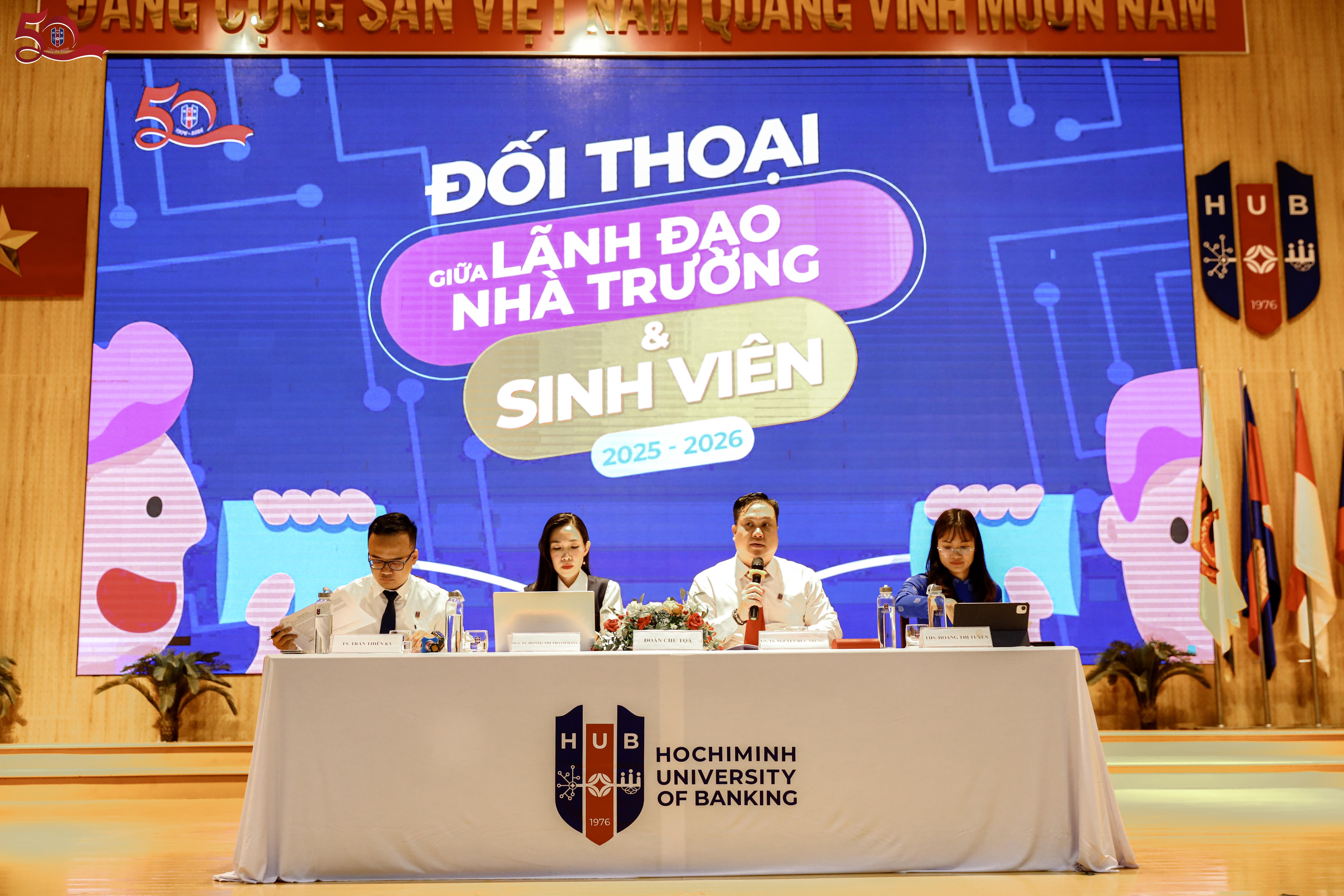 Ngày 09/04/2026, Tại Hội trường lớn, cơ sở 56 Hoàng Diệu 2, Trường Đại học Ngân hàng TP.HCM tổ chức chương trình Đối thoại giữa Lãnh đạo Nhà trường và Sinh viên năm học 2025 – 2026