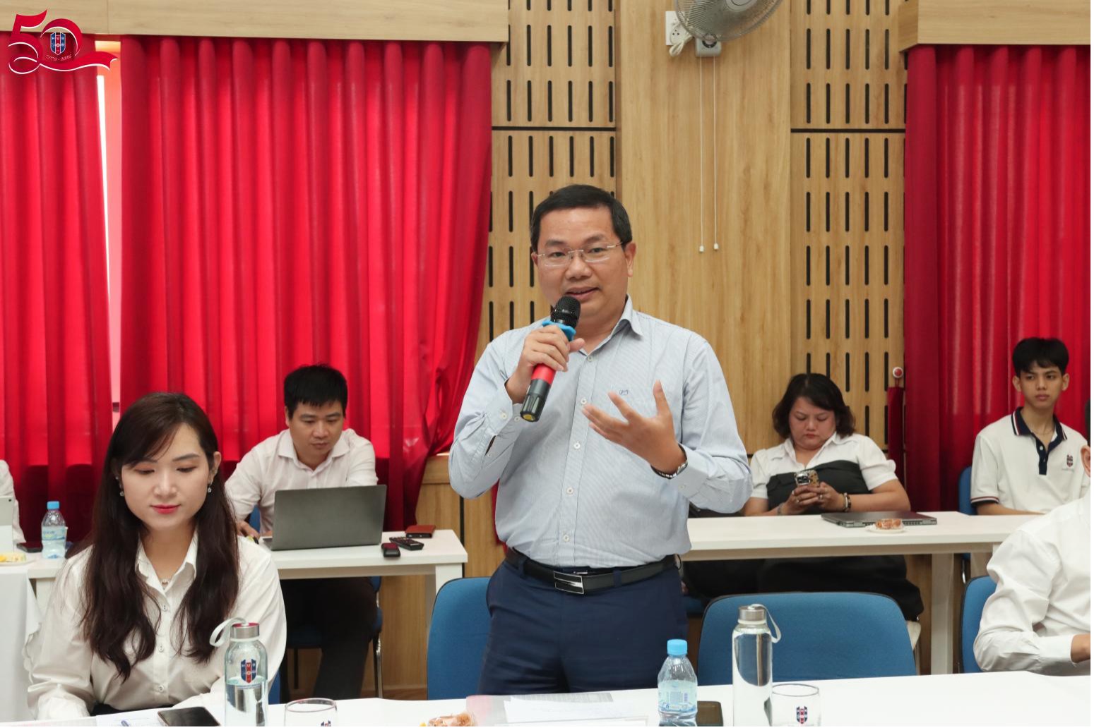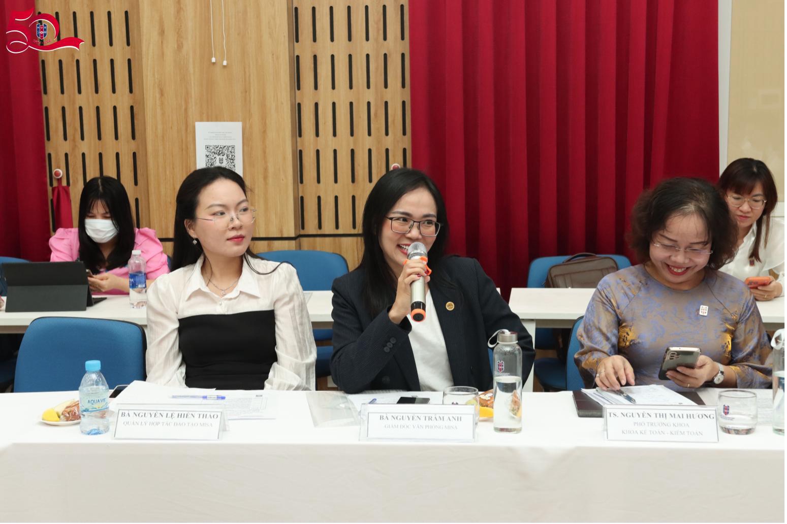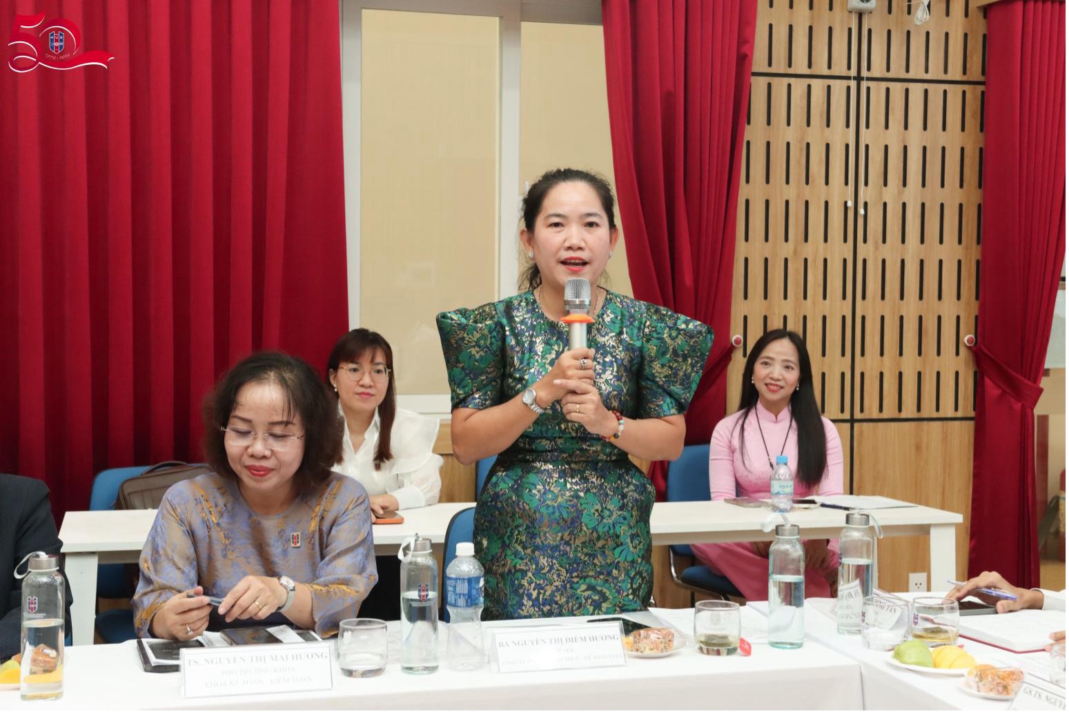 Bà Nguyễn Thị Diễm Hương (Giám đốc Công ty TNHH Tư vấn Thuế - Kế toán TaTa): Doanh nghiệp bền vững cần đảm bảo bốn trụ cột chính gồm khách hàng, nhân sự, tài chính và hệ thống quản trị. Trong đó, yếu tố nhân sự giữ vai trò đặc biệt quan trọng, nhất là việc xây dựng môi trường làm việc tích cực. Trên cơ sở đó, đề xuất nhà trường xem xét lồng ghép nội dung quản trị cảm xúc vào chương trình đào tạo, nhằm trang bị cho sinh viên kỹ năng thích ứng khi tham gia thị trường lao động.