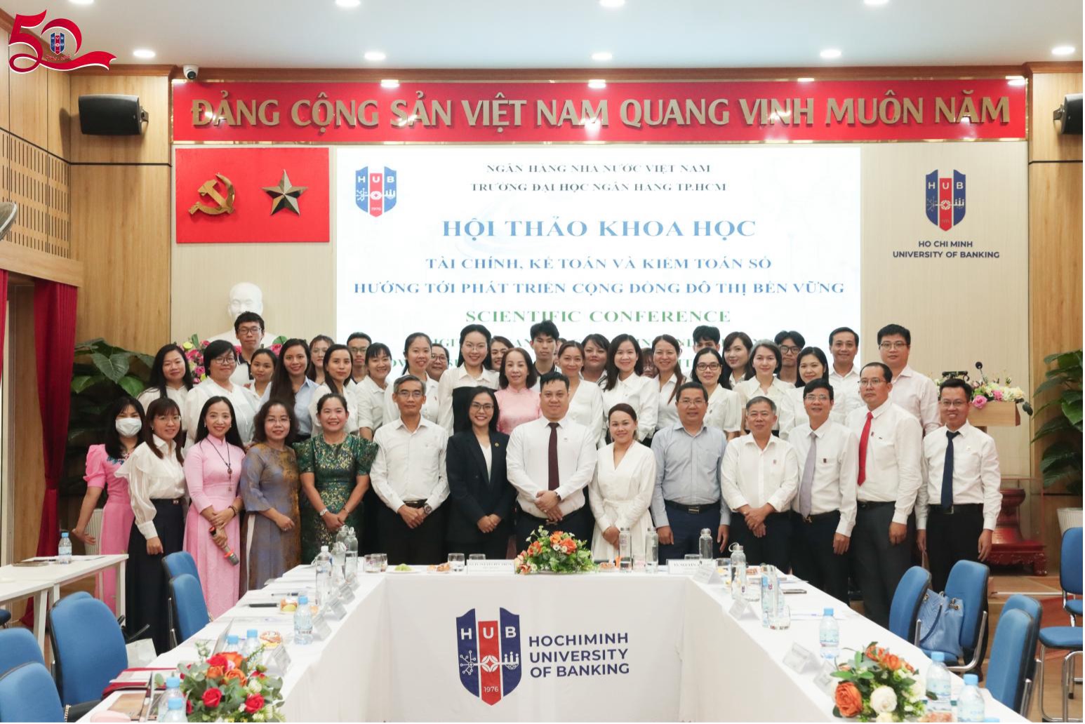 Ban tổ chức cùng đại biểu và khách mời chụp hình lưu niệm tại Hội thảo khoa học cấp Trường HUB 2026