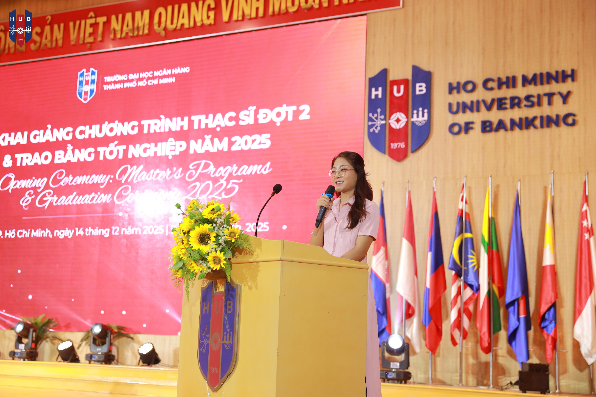 Đại diện cho các tân học viên, chị Đặng Thị Yến Nhi - Học viên Cao học ngành Quản trị Kinh doanh đã bày tỏ niềm xúc động, vinh dự và quyết tâm cao độ khi chính thức bước vào môi trường học thuật chuyên sâu tại HUB. Chia sẻ về lý do chọn HUB, chị nhấn mạnh: “Chúng em tin chọn Trường Đại học Ngân hàng TP.HCM không chỉ vì uy tín đào tạo hay sự gắn kết thực tiễn, mà còn bởi nơi đây lan tỏa tinh thần nhân văn và một môi trường học tập hạnh phúc. Đó chính là nền tảng quan trọng giúp người học rèn luyện tư duy và nâng cao năng lực thích ứng trong bối cảnh đầy biến động hiện nay."