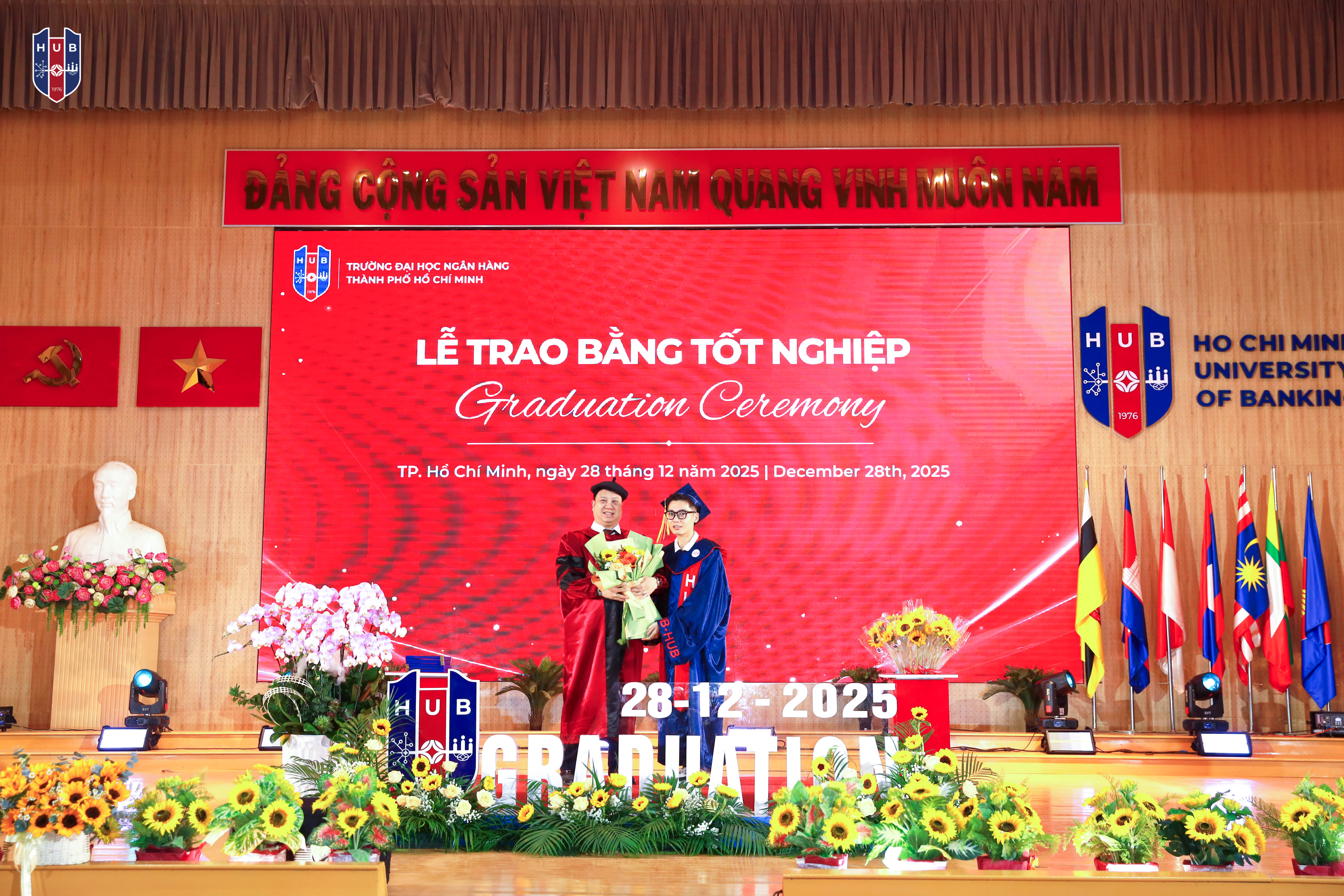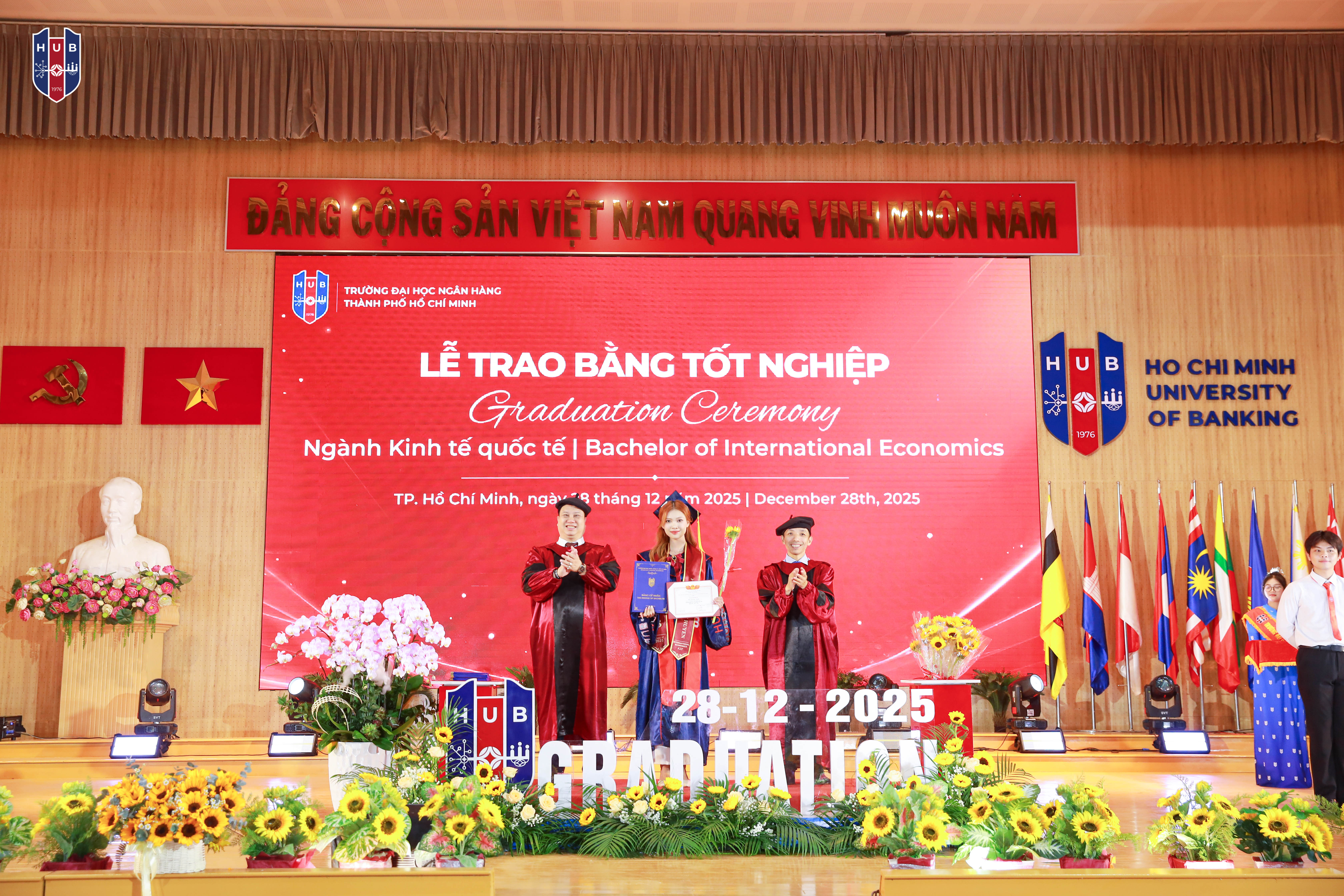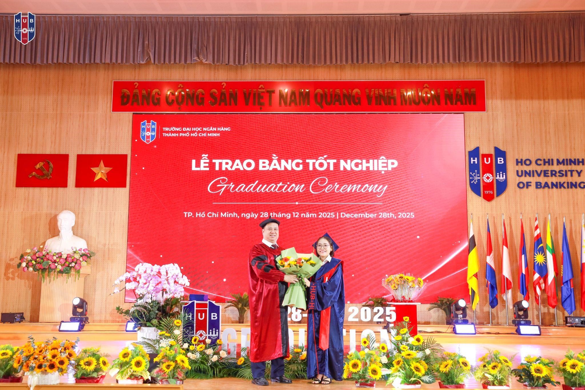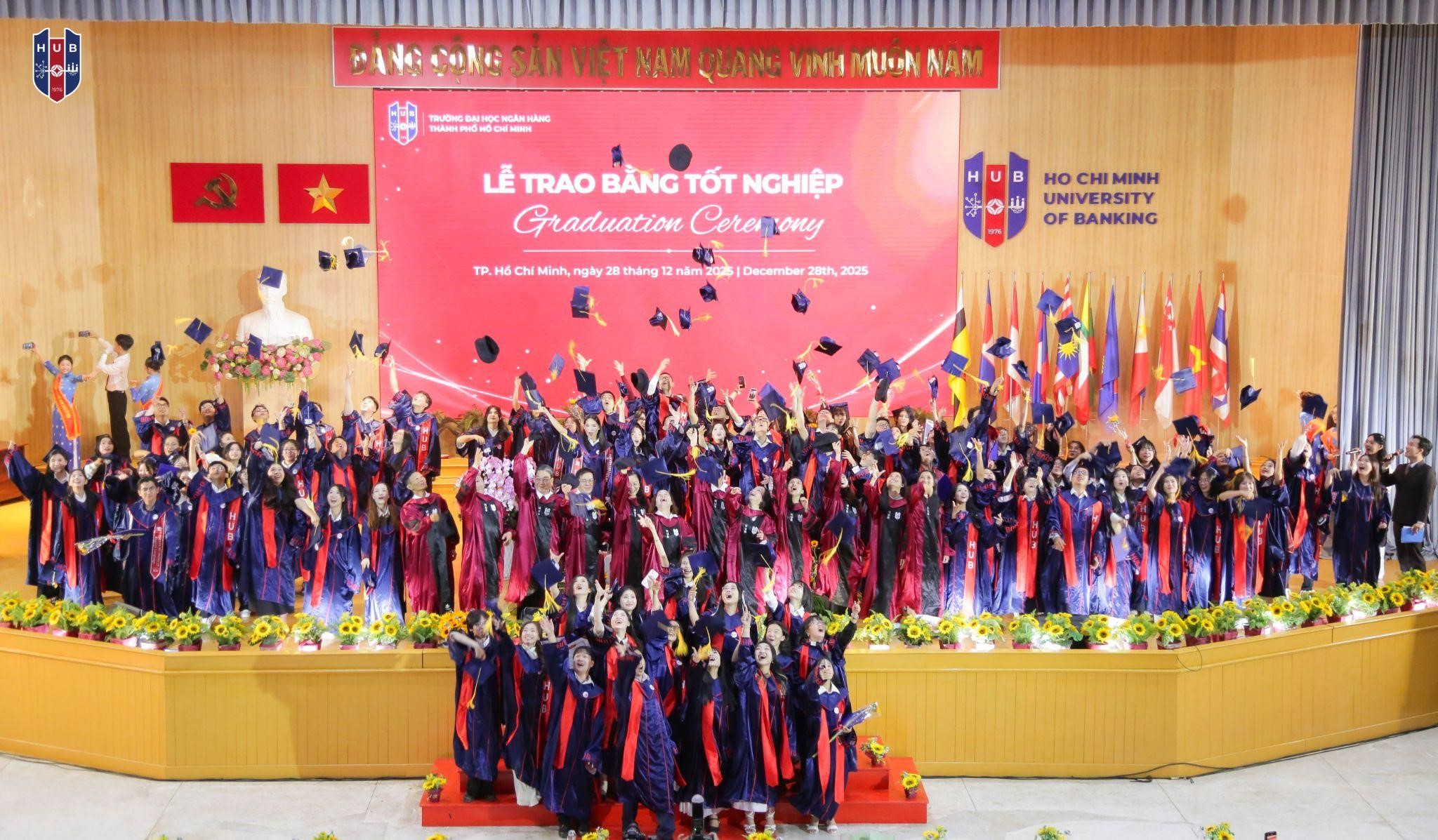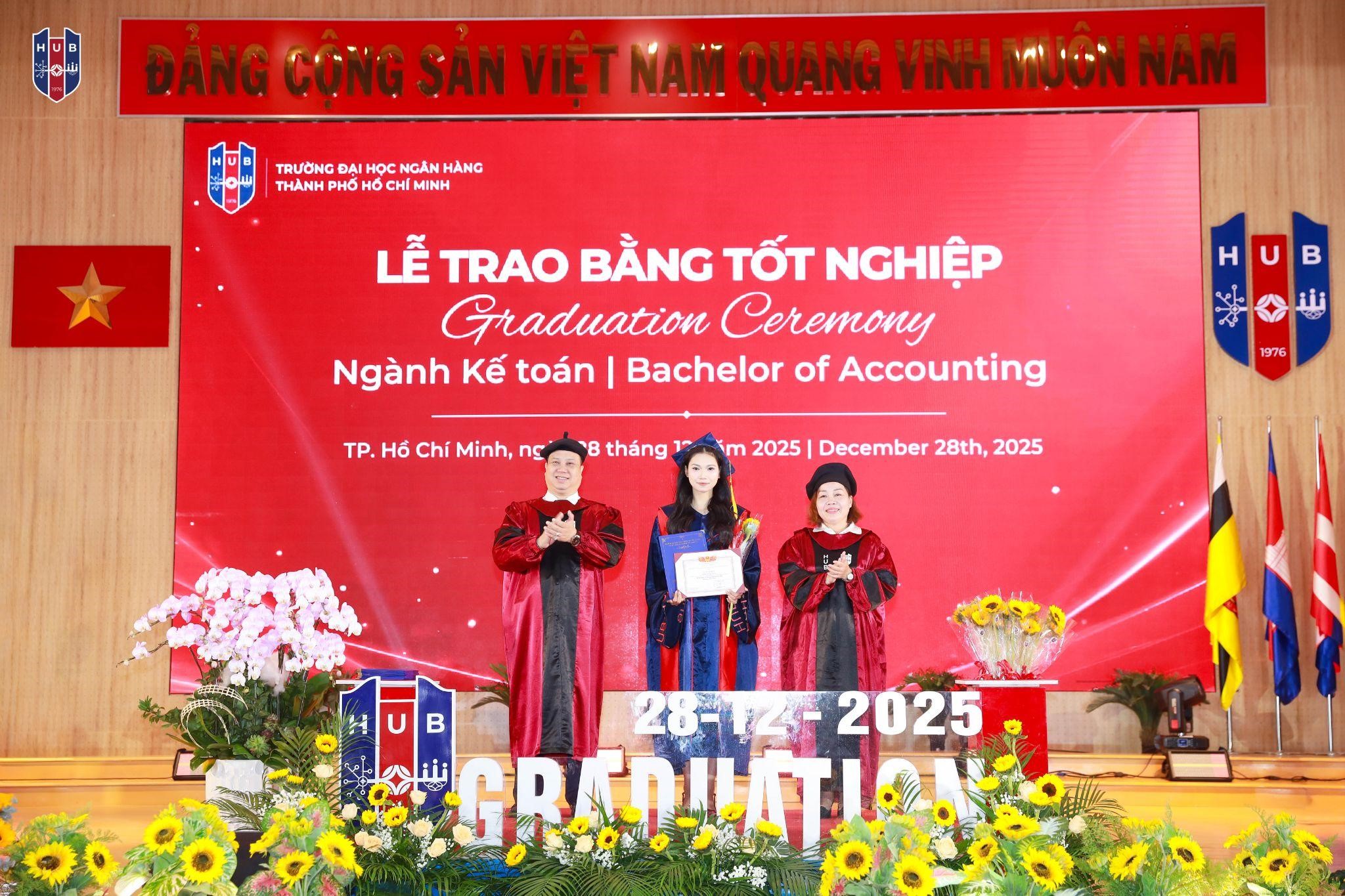 Chủ nhật (28/12/2025), tại cơ sở 56 Hoàng Diệu 2 phường Thủ Đức, Trường Đại học Ngân hàng TP.HCM (HUB) đã long trọng tổ chức Lễ trao bằng Tốt nghiệp và vinh danh thành tích cho hơn 600 Tân cử nhân ngành Kế toán, Ngôn ngữ Anh, Kinh tế Quốc tế, Luật Kinh tế, Hệ thống thông tin Quản lý và Khoa học dữ liệu trong kinh doanh thuộc chương trình Đại học chính quy và Tiếng Anh bán phần.