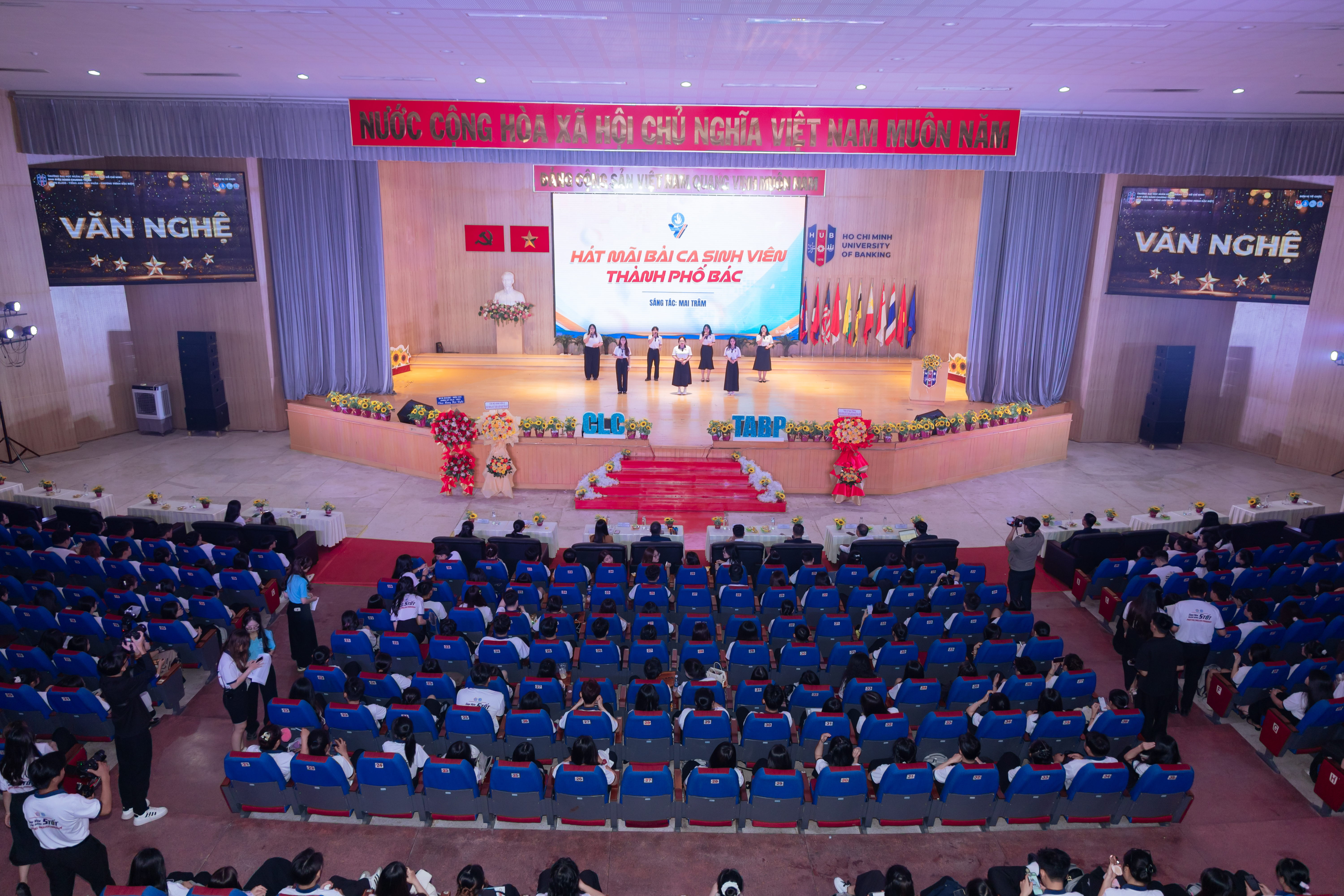 Buổi lễ tuyên dương được mở đầu bằng các tiết mục văn nghệ với chủ đề “Việt Nam từ trái tim”, mang đến bầu không khí trang nghiêm nhưng vẫn giàu cảm xúc, thể hiện tinh thần tự hào dân tộc và sự nhiệt huyết của sinh viên HUB.