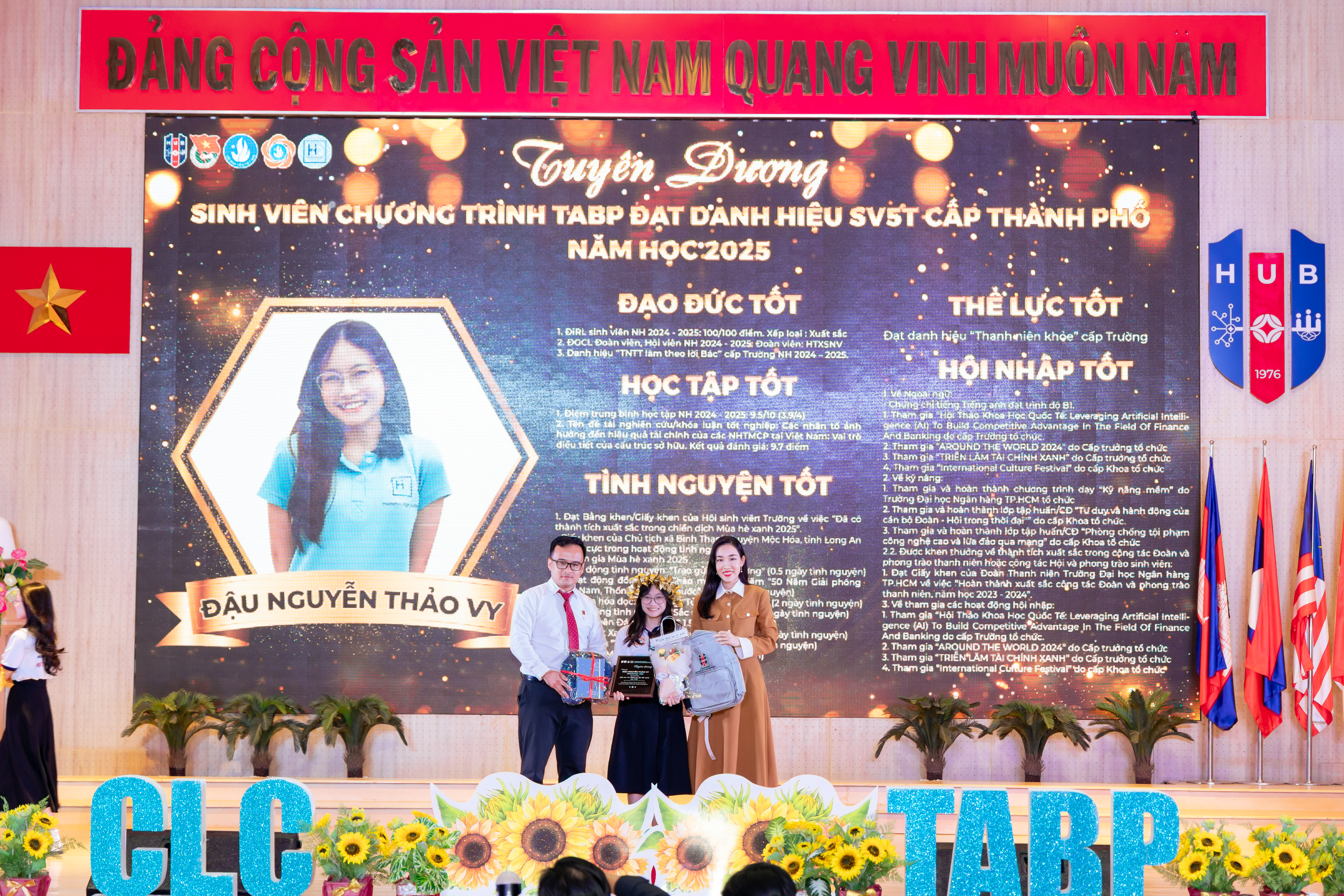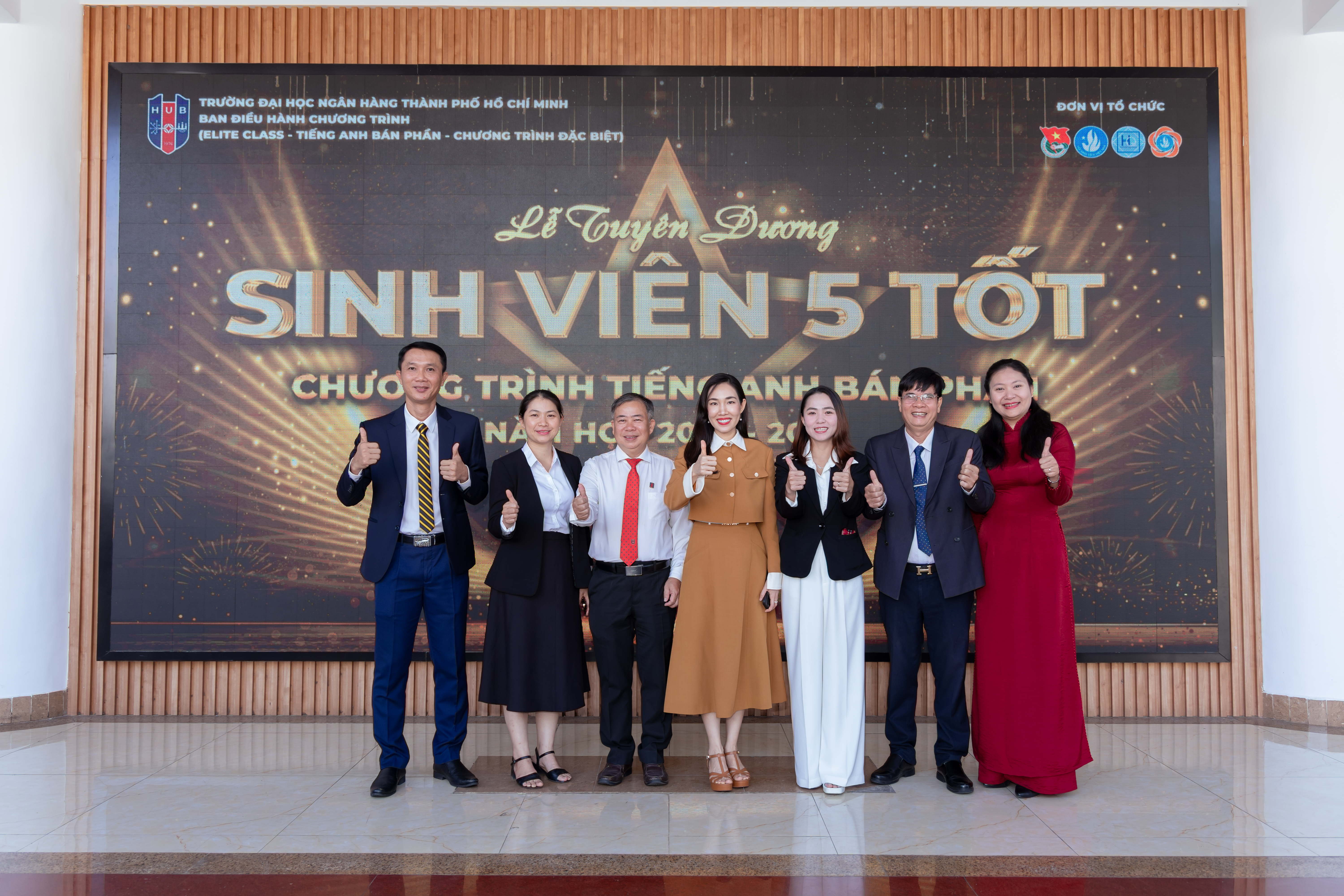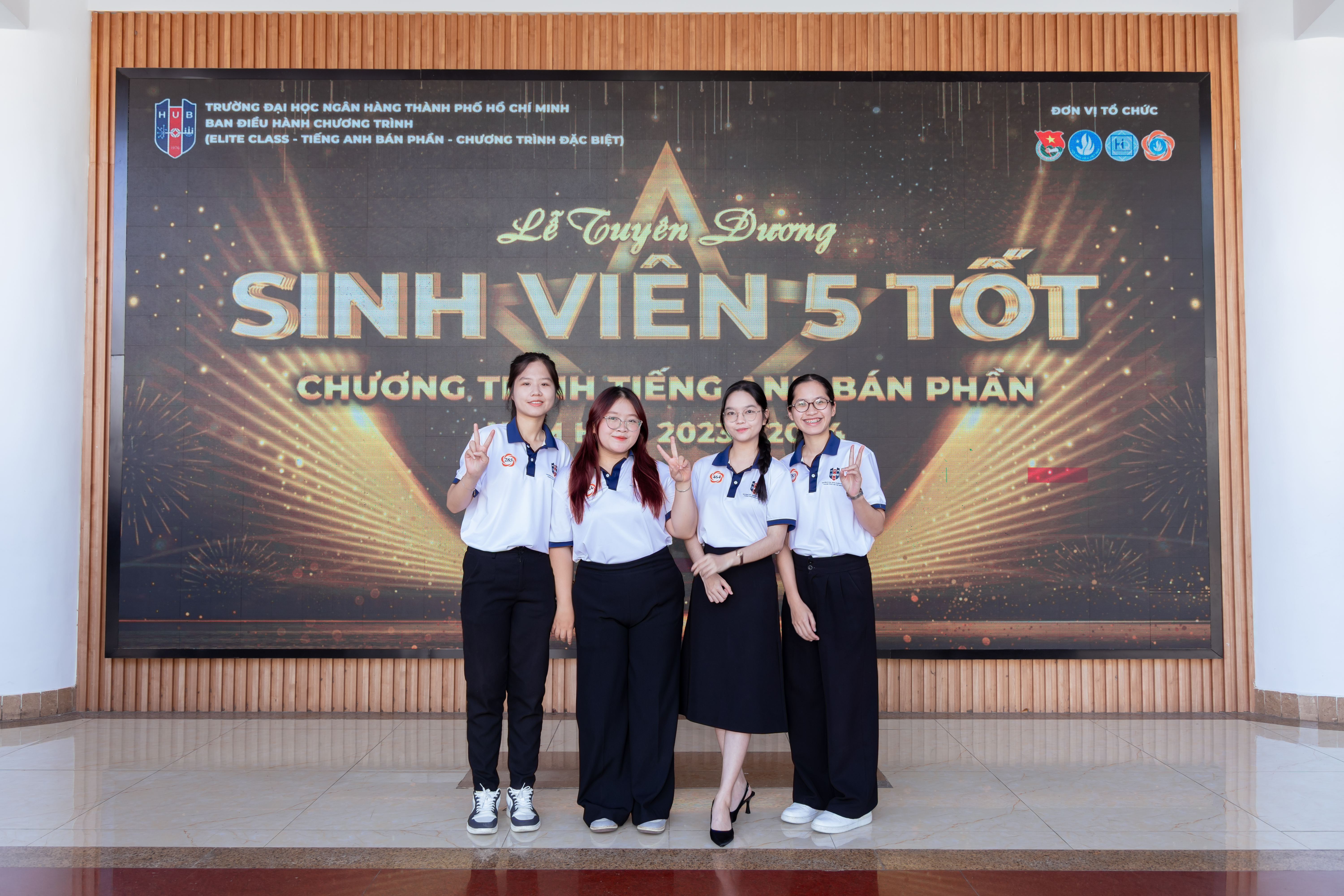 Nghi thức khen thưởng và trao giấy khen, giấy chứng nhận cho 523 sinh viên đạt danh hiệu, trong đó 256 sinh viên đạt danh hiệu “Sinh viên 5 tốt cấp Liên chi”, 238 sinh viên đạt danh hiệu “Sinh viên 5 tốt cấp Trường”, 25 sinh viên đạt danh hiệu “Sinh viên năm tốt 03 năm” và 04 sinh viên đạt “Sinh viên 5 tốt cấp Thành phố” được tiến hành trang trọng, thể hiện sự ghi nhận của Nhà trường đối với những nỗ lực bền bỉ, tinh thần cầu tiến nổi bật của sinh viên chương trình Tiếng Anh bán phần.