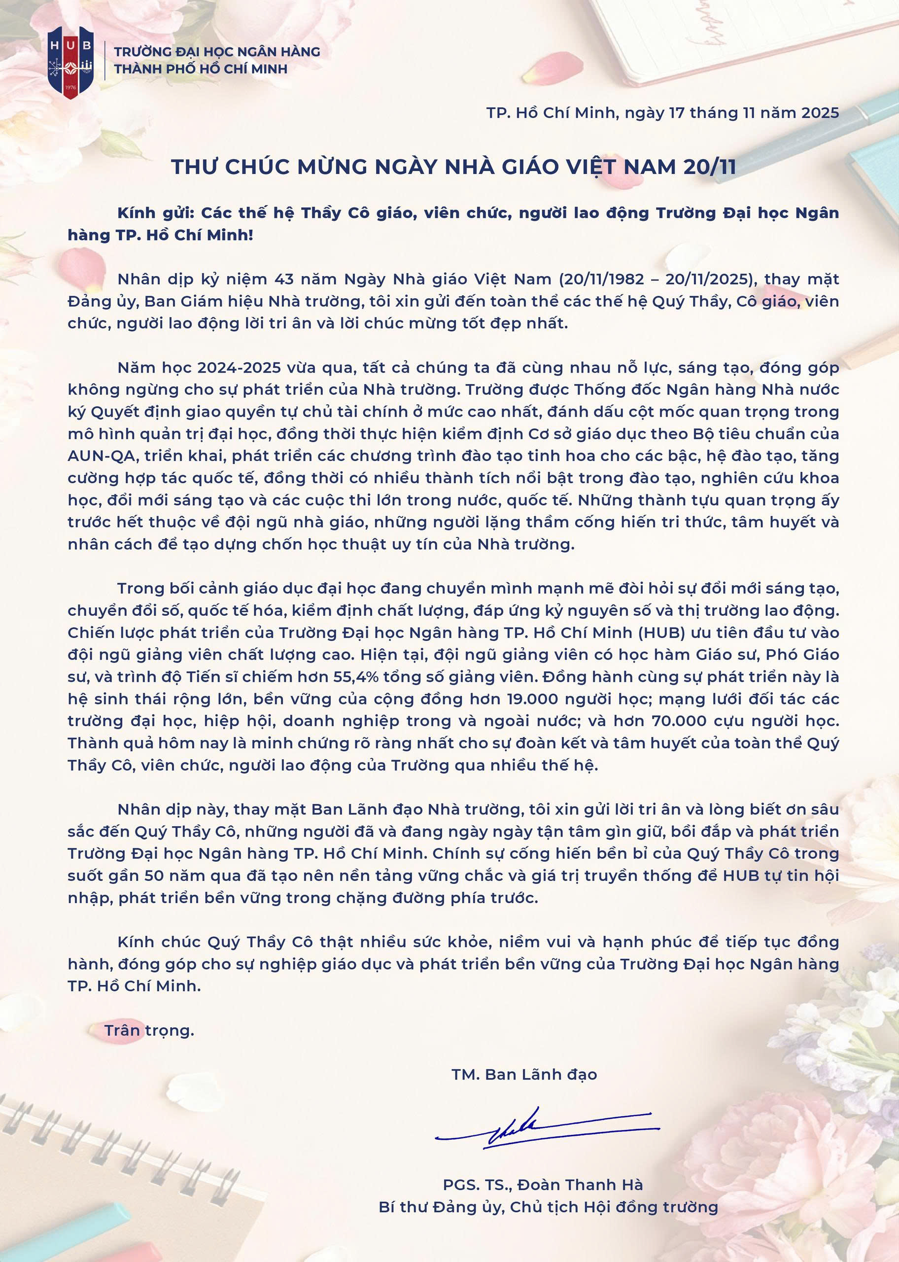 Thư chúc mừng của Ban lãnh đạo HUB nhân dịp kỷ niệm 43 năm Ngày Nhà giáo Việt Nam (20/11/1982-20/11/2025)