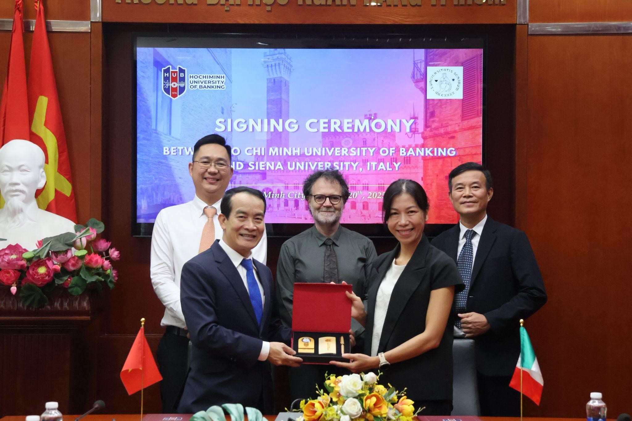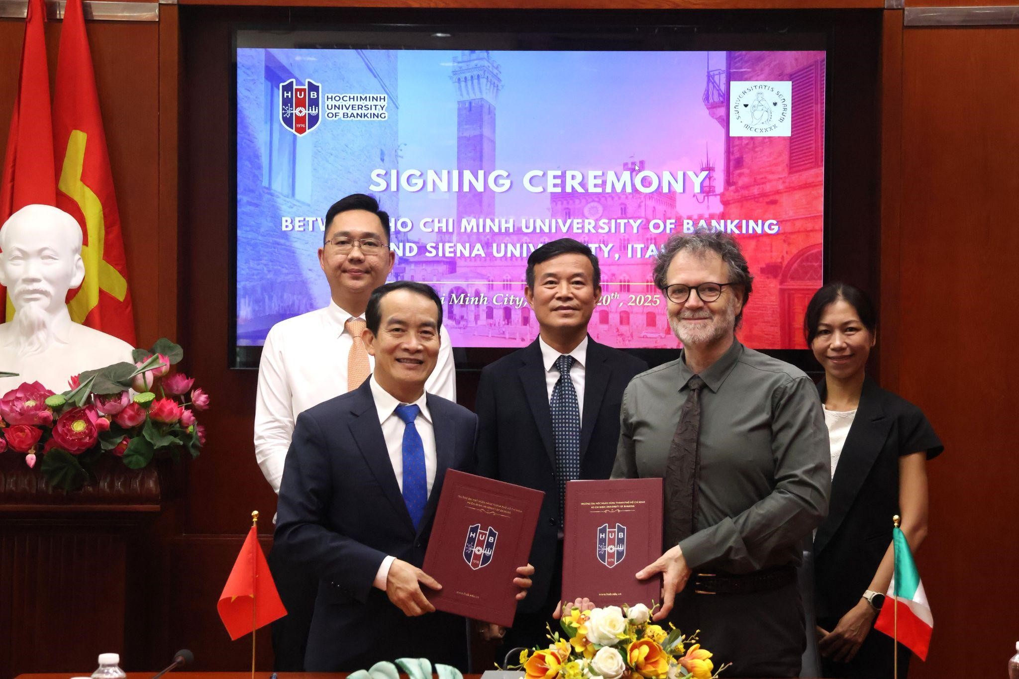 Ngày 20/10/2025, Trường Đại học Ngân hàng TP. Hồ Chí Minh (HUB) đã tổ chức lễ ký kết Biên bản ghi nhớ hợp tác với Văn phòng Uni-Italia tại Việt Nam và Trường Đại học Siena (Cộng hòa Ý). Sự kiện đánh dấu bước phát triển mới trong mối quan hệ hợp tác quốc tế giữa HUB và các đối tác giáo dục uy tín của Ý, mở ra nhiều cơ hội học tập, nghiên cứu và giao lưu học thuật dành cho sinh viên và giảng viên của Nhà trường.