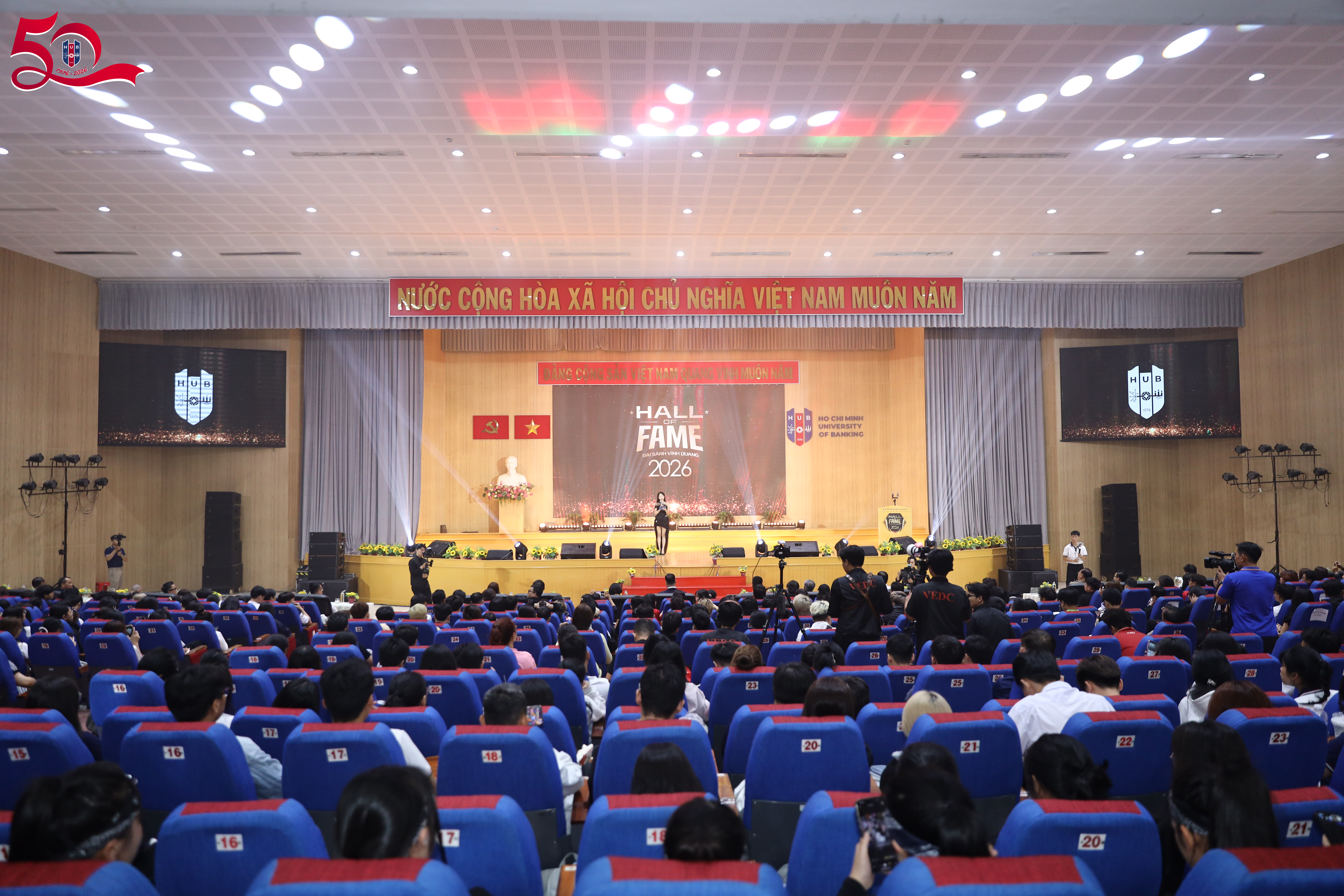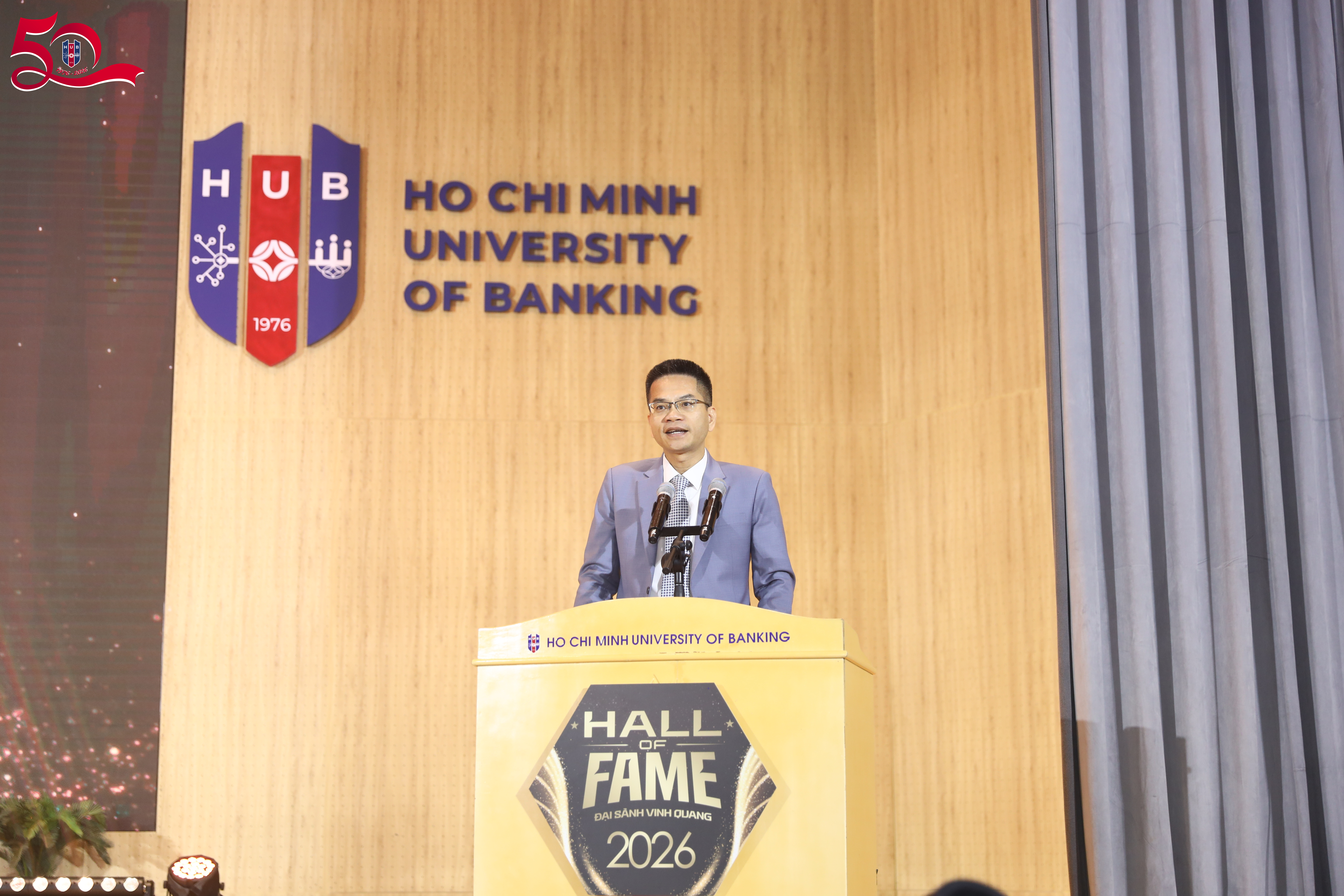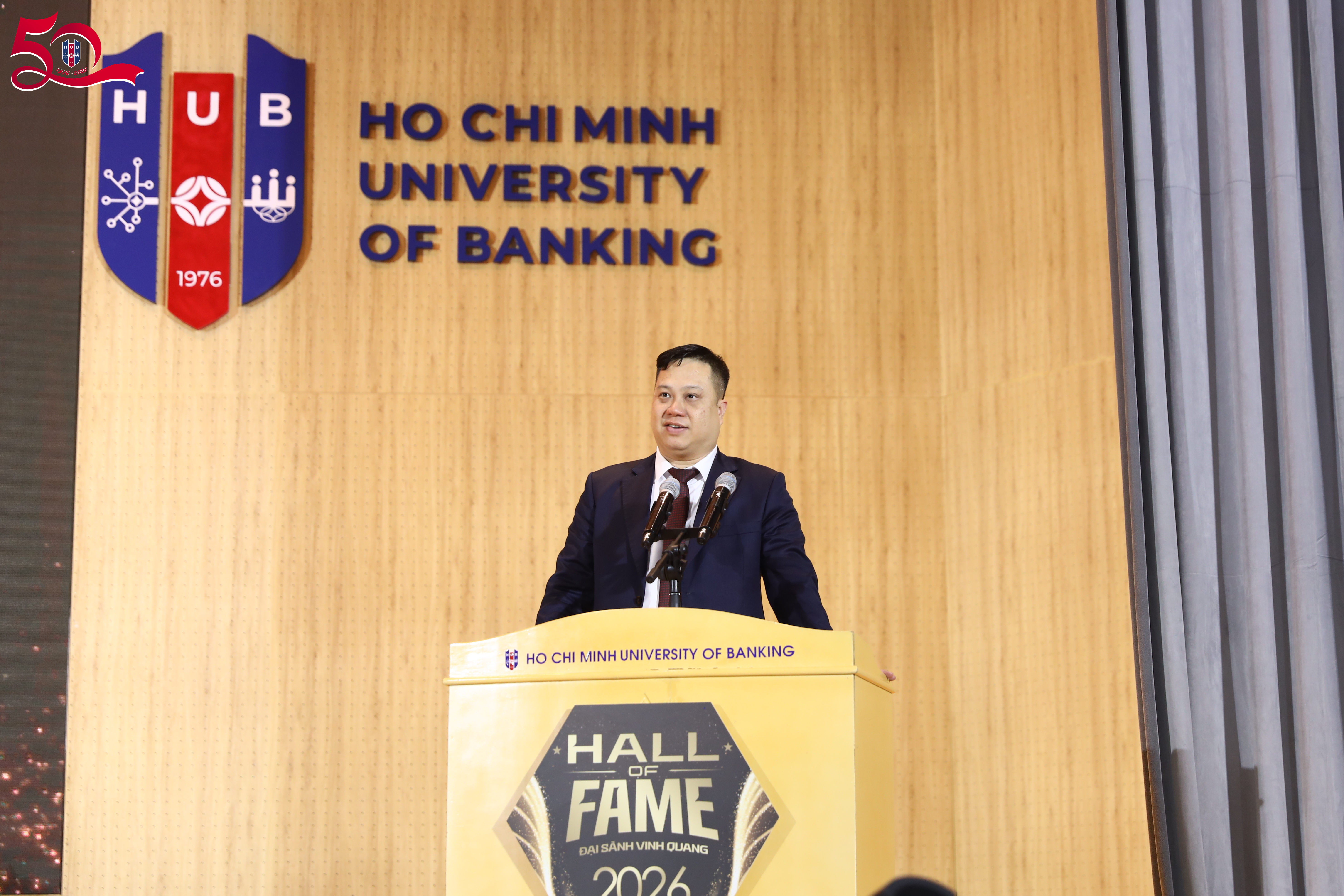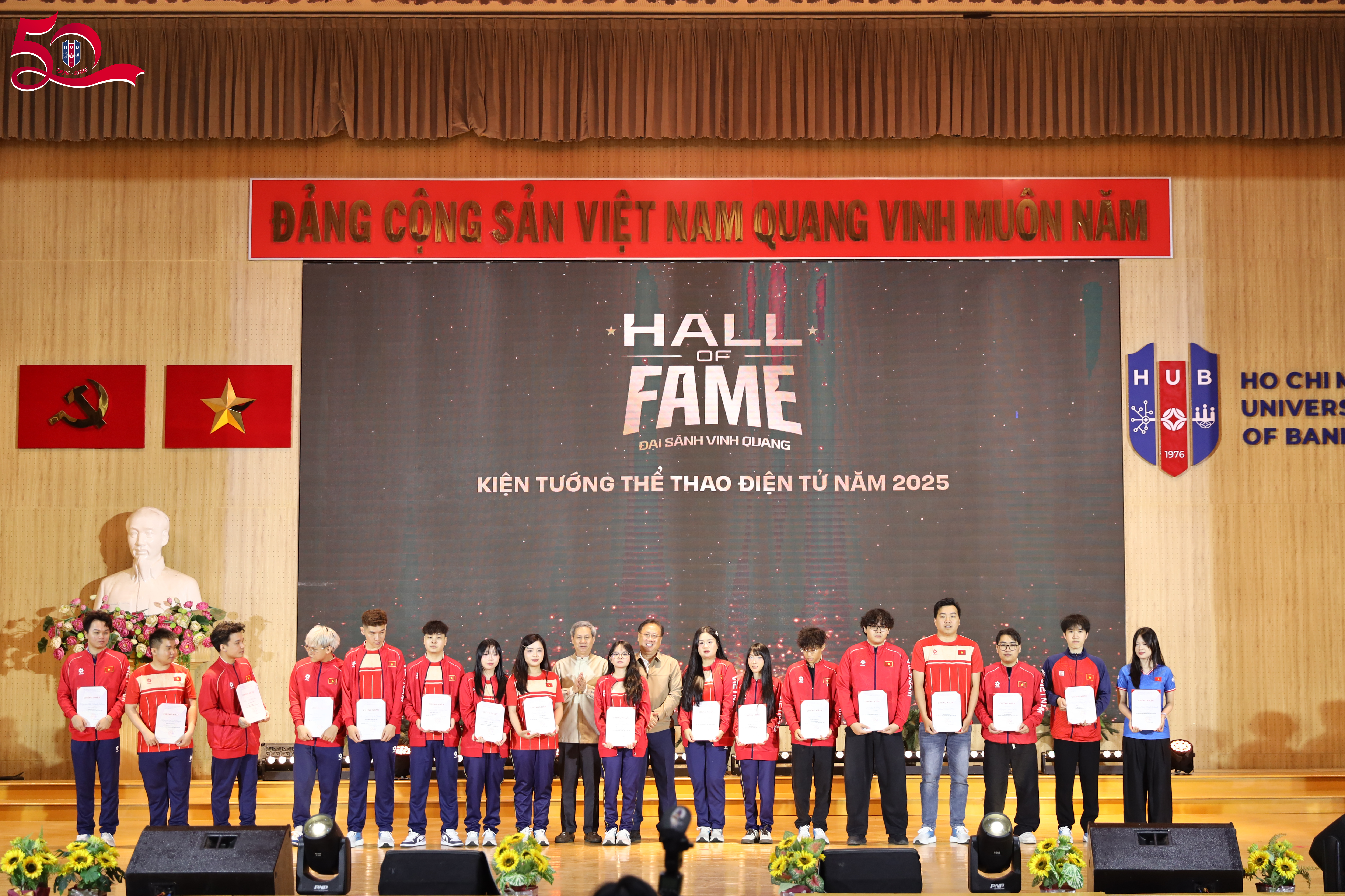 Sáng ngày 18/3, chương trình Hall of Fame – Đại sảnh Vinh Quang 2026 đã diễn ra tại cơ sở 56 Hoàng Diệu 2 trong không khí trang trọng, quy tụ đông đảo đại biểu, khách mời và cộng đồng thể thao điện tử. Trường Đại học Ngân hàng TP.HCM (HUB) vinh dự là đơn vị phối hợp tổ chức sự kiện, góp phần lan tỏa giá trị và tôn vinh những thành tựu nổi bật của thể thao điện tử Việt Nam trong năm qua.