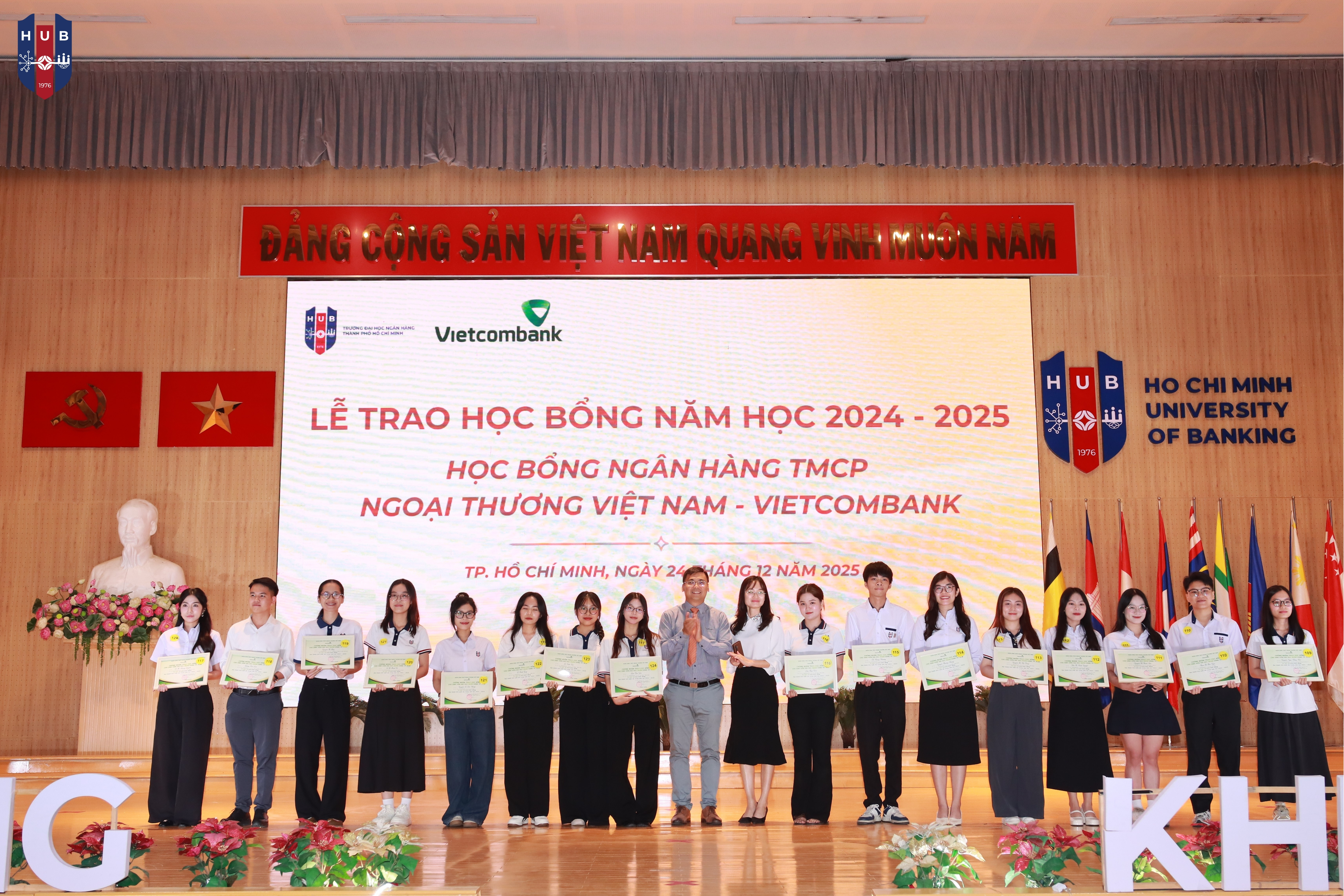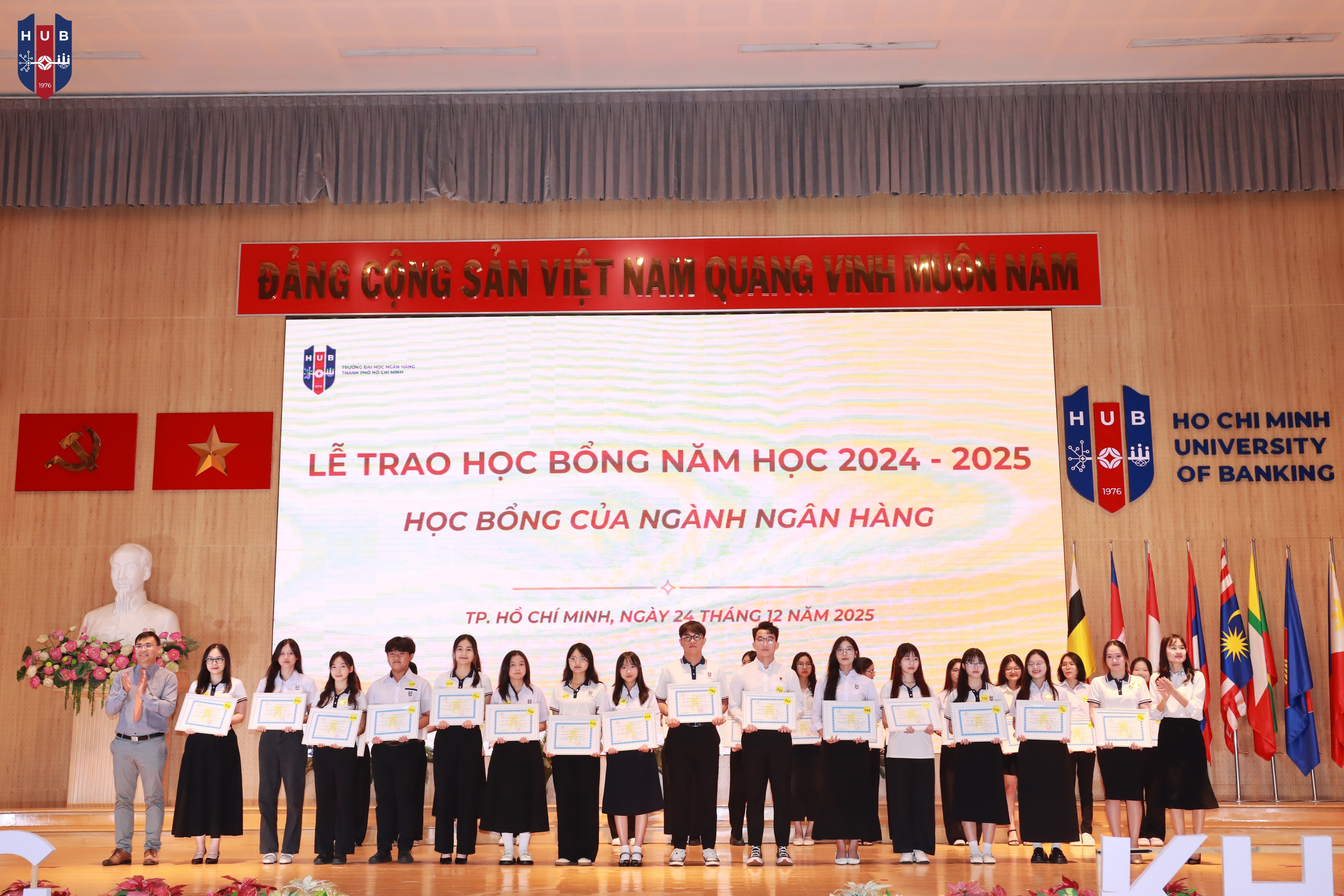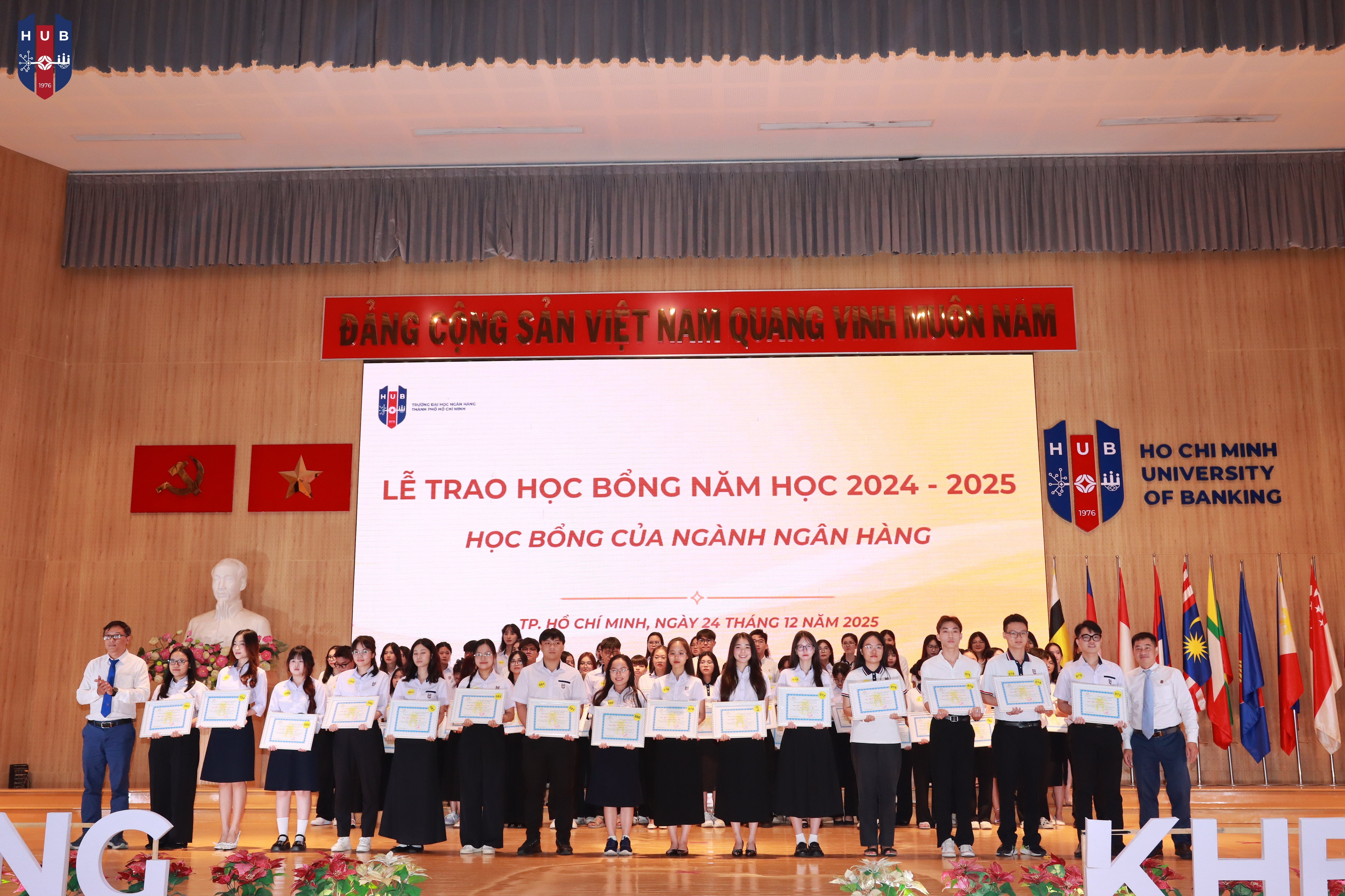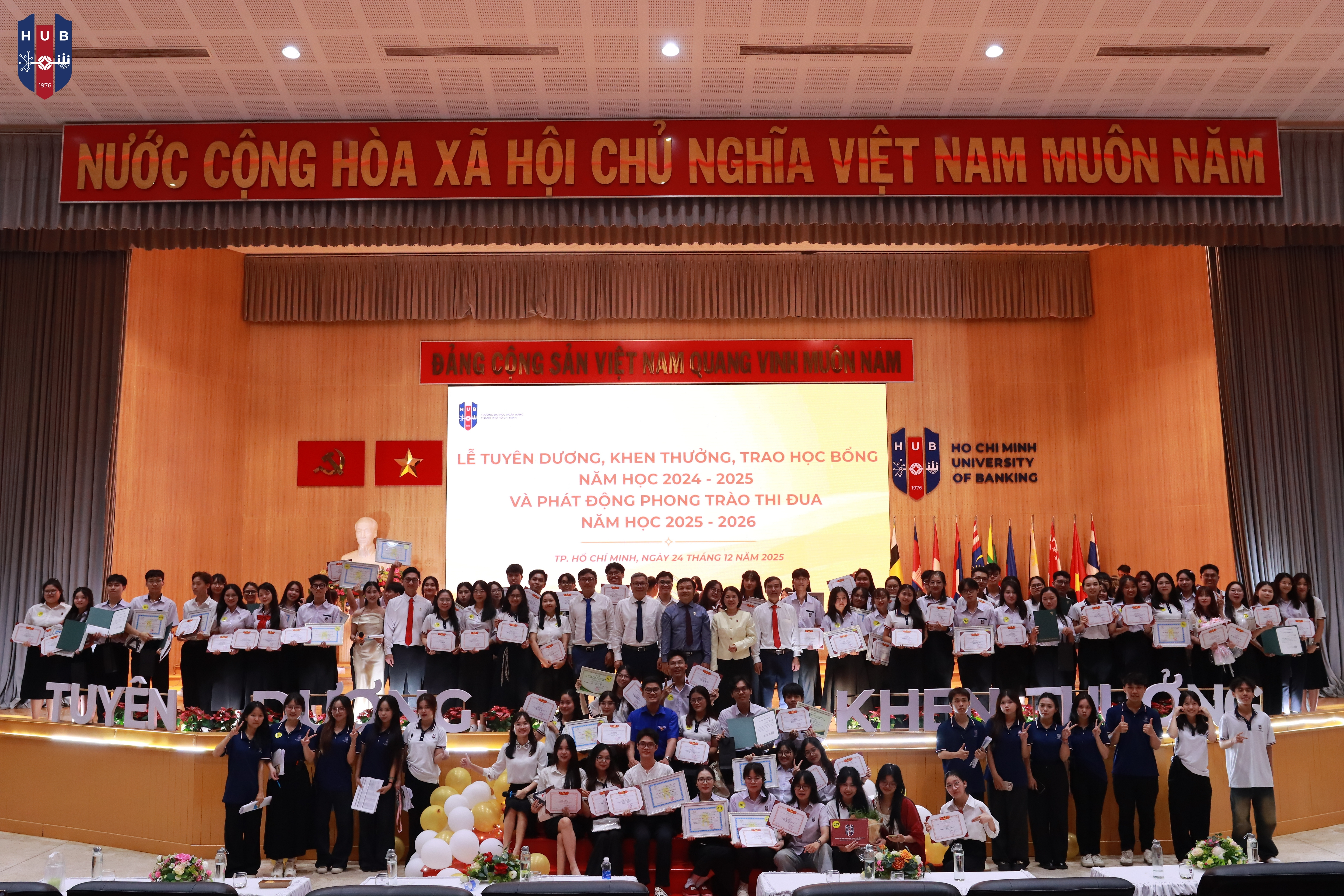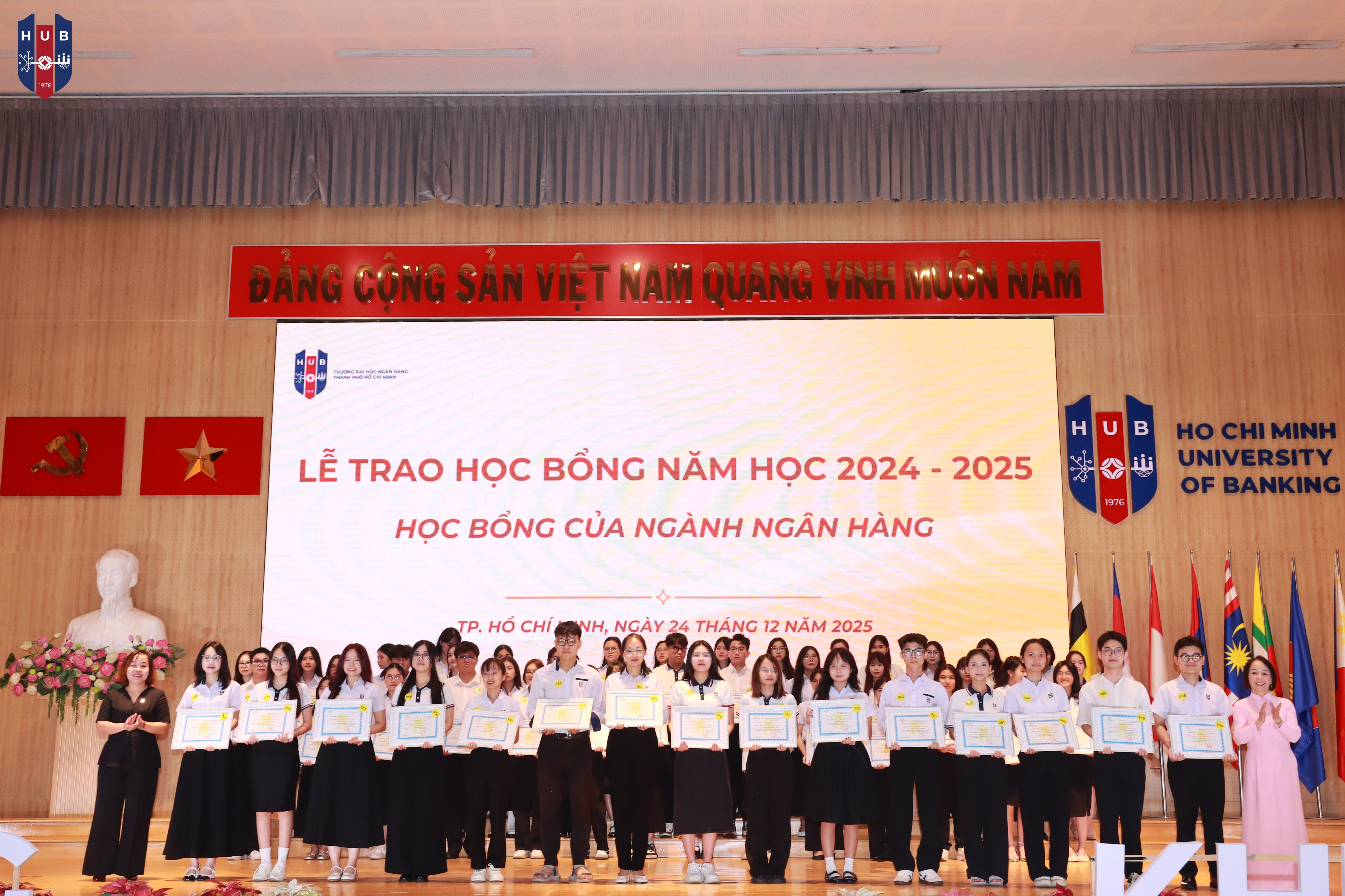 Chiều ngày 24/12/2025, tại Hội trường lớn – Cơ sở Thủ Đức, Trường Đại học Ngân hàng TP. Hồ Chí Minh đã long trọng tổ chức Lễ tuyên dương, khen thưởng, trao học bổng năm học 2024 – 2025 và phát động phong trào thi đua năm học 2025 – 2026. Buổi lễ nhằm tổng kết, ghi nhận và vinh danh những tập thể, cá nhân sinh viên có thành tích xuất sắc trong học tập, rèn luyện và hoạt động phong trào trong năm học vừa qua.