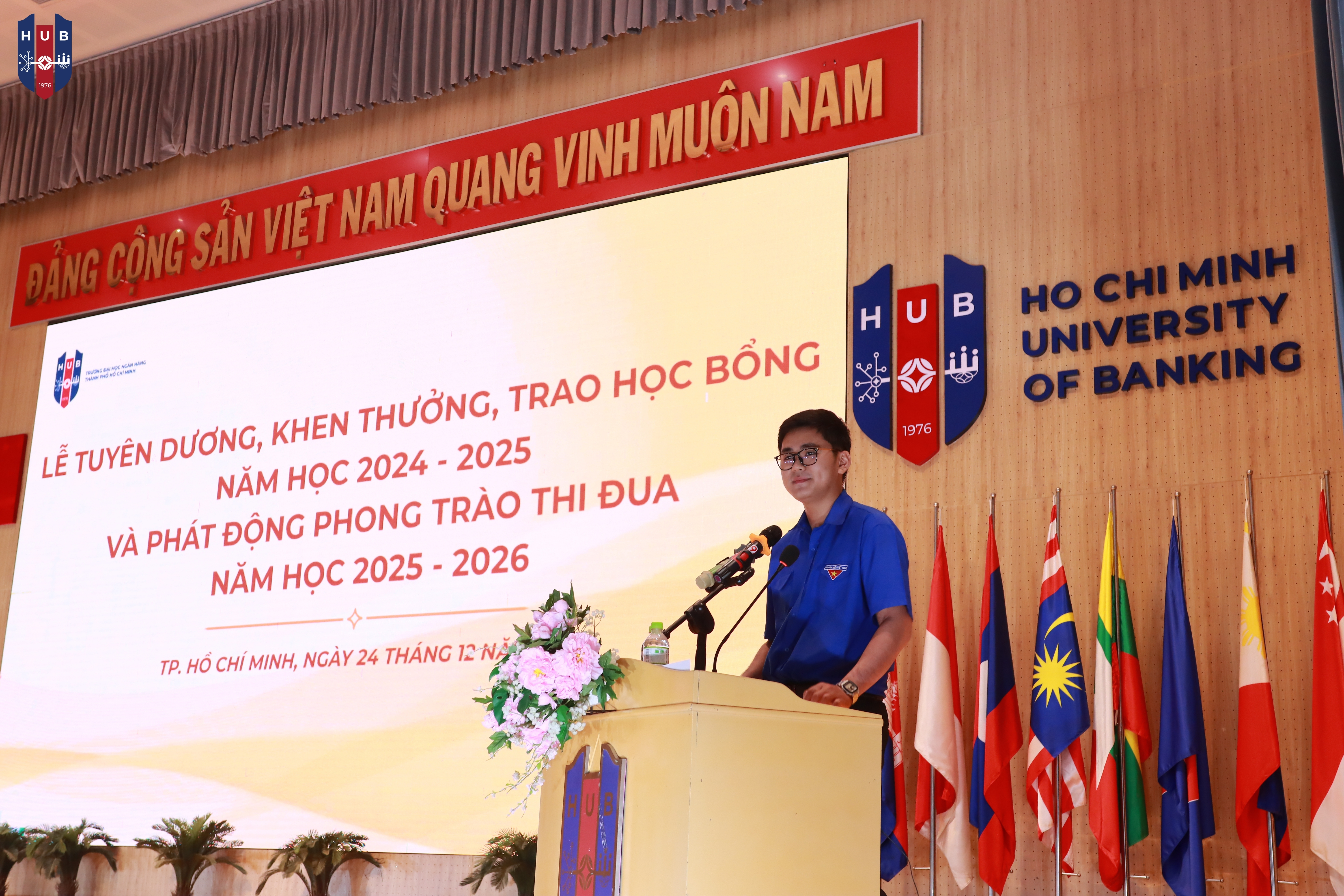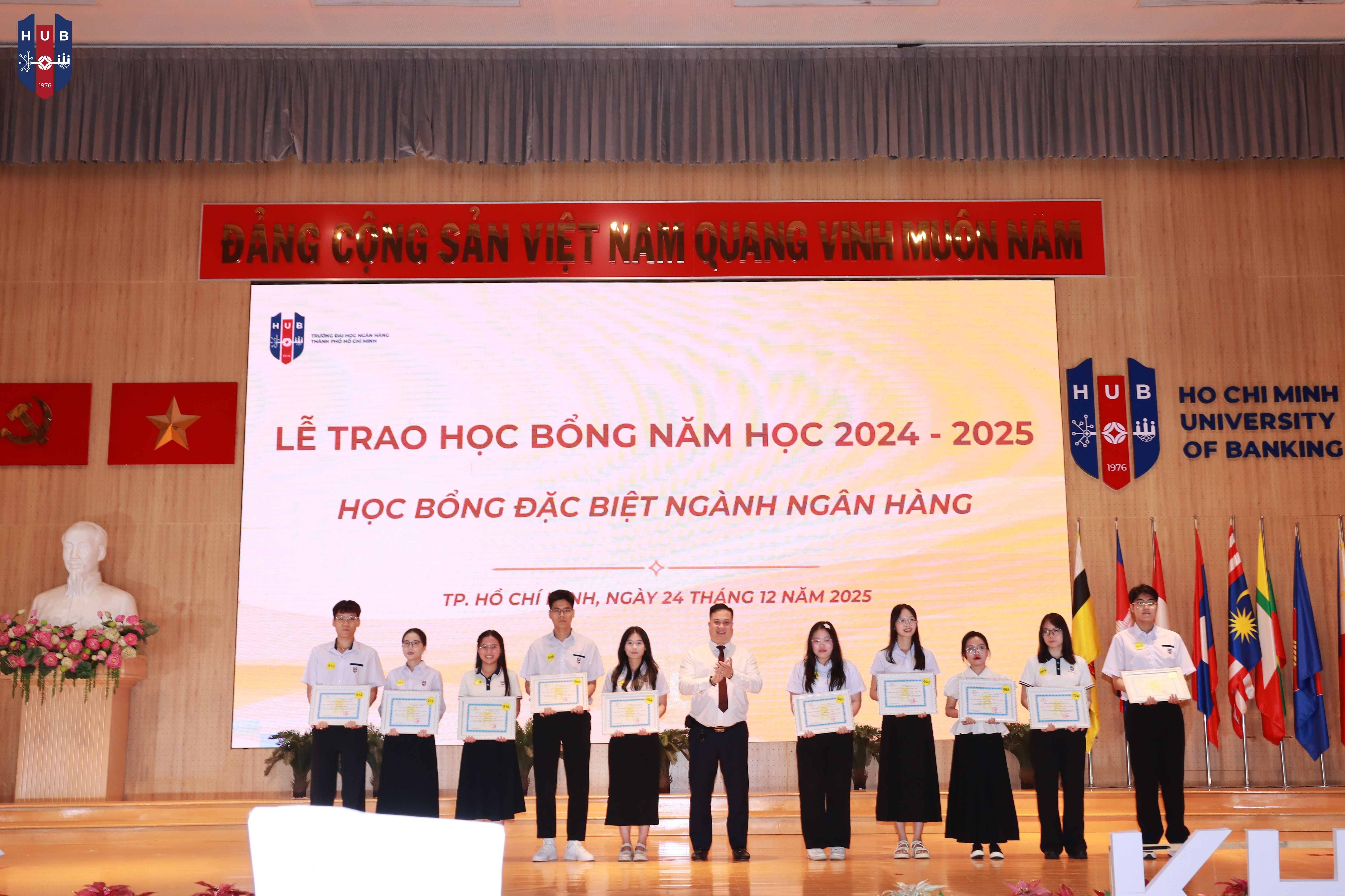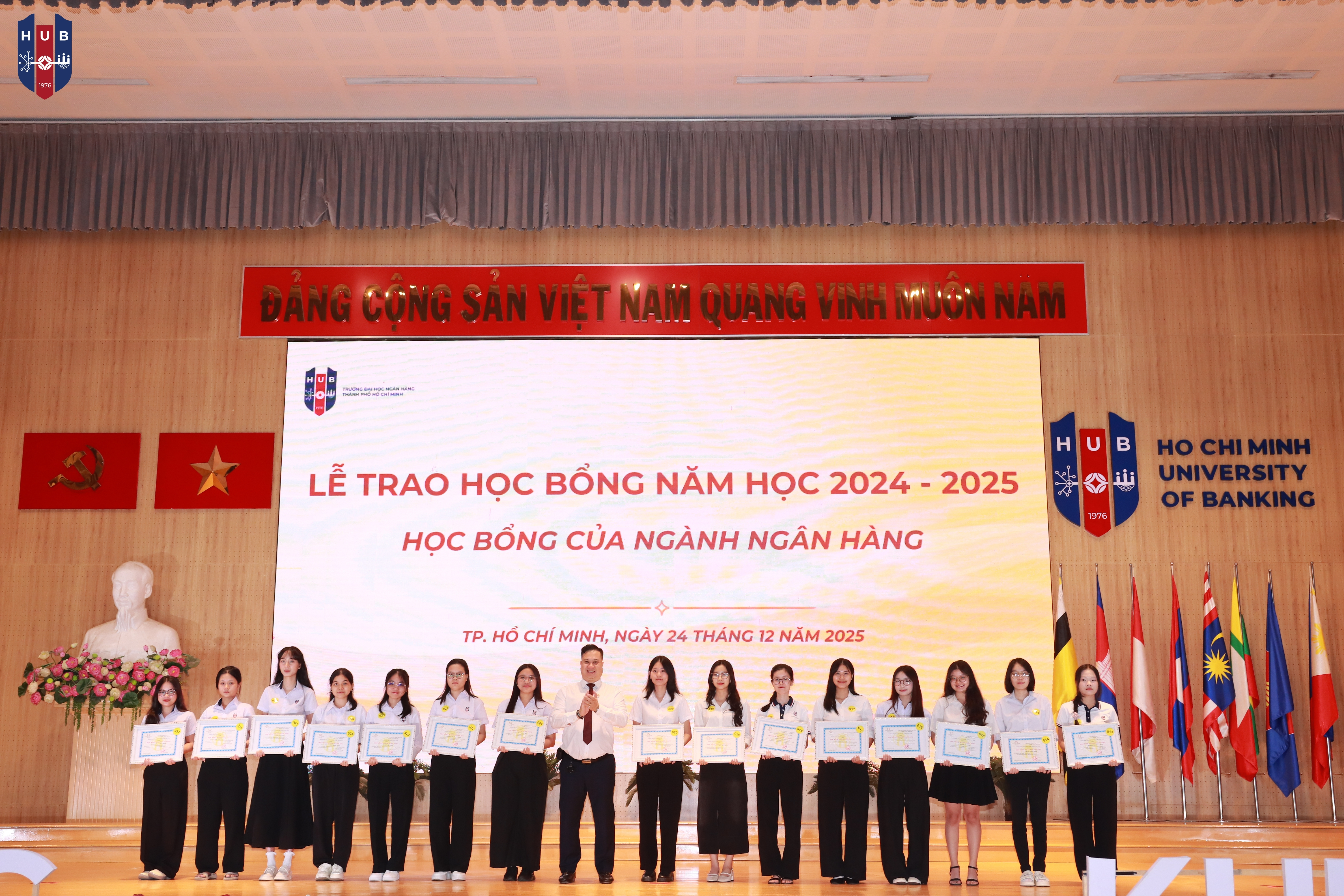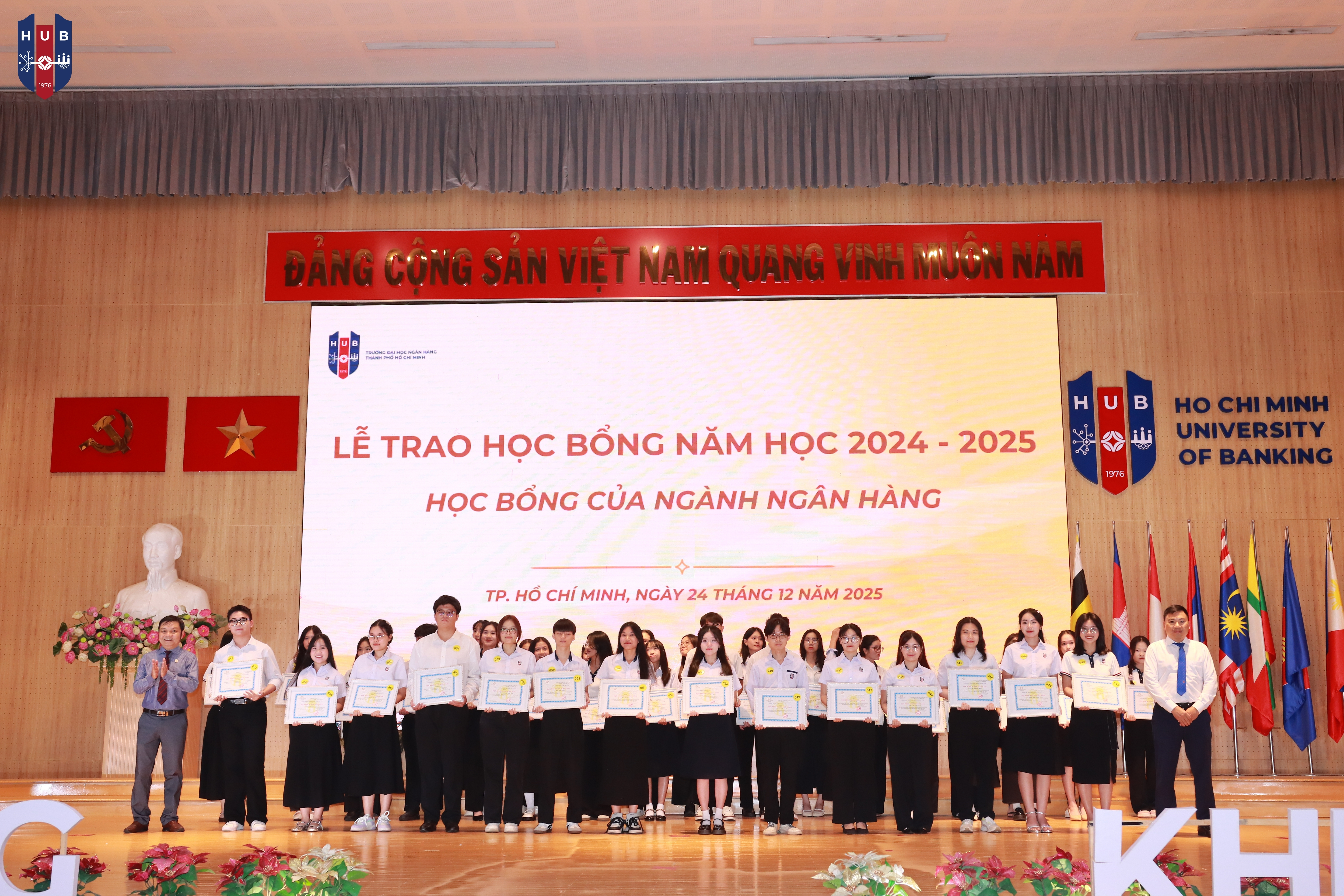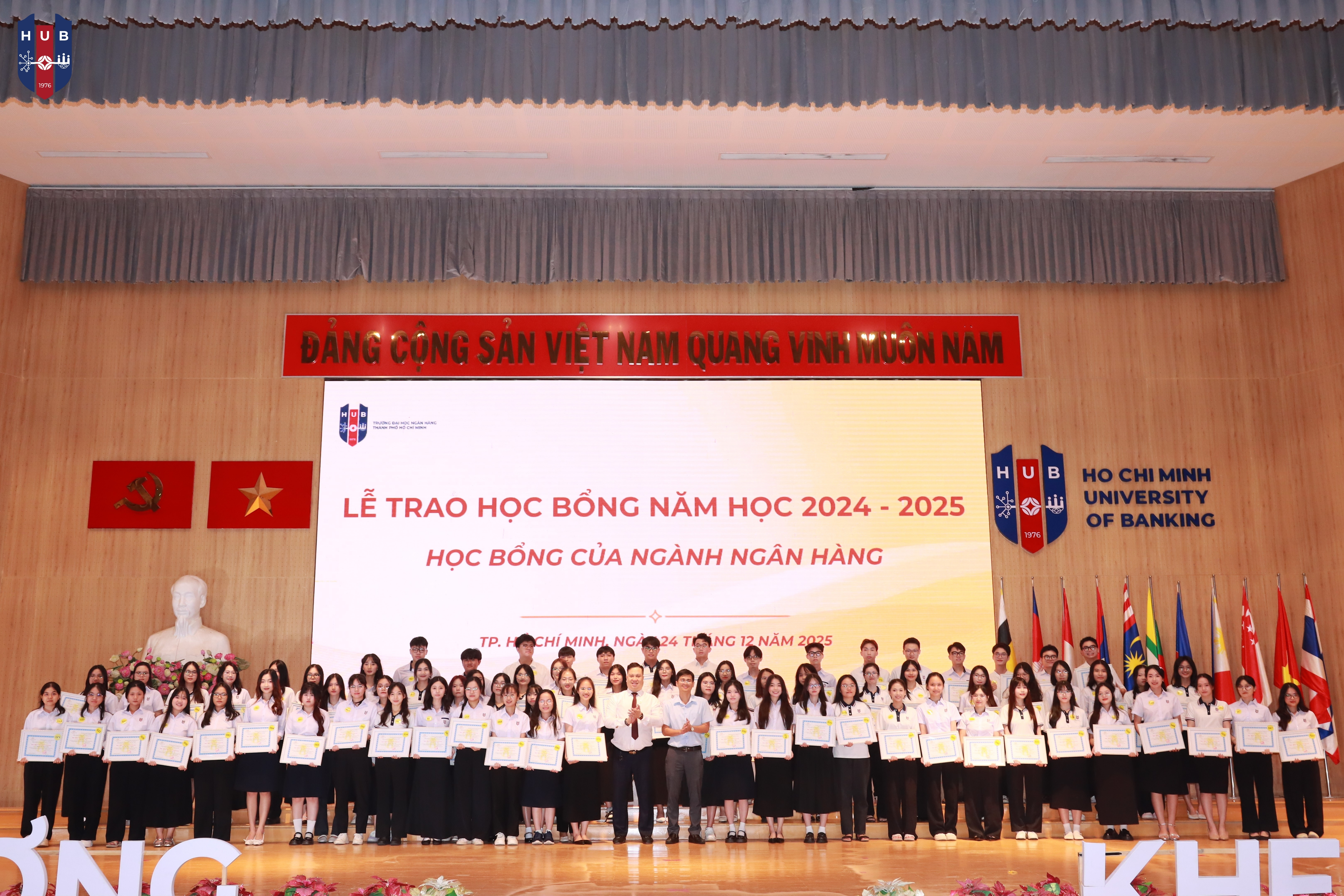 Chiều ngày 24/12/2025, tại Hội trường lớn – Cơ sở Thủ Đức, Trường Đại học Ngân hàng TP. Hồ Chí Minh đã long trọng tổ chức Lễ tuyên dương, khen thưởng, trao học bổng năm học 2024 – 2025 và phát động phong trào thi đua năm học 2025 – 2026. Buổi lễ nhằm tổng kết, ghi nhận và vinh danh những tập thể, cá nhân sinh viên có thành tích xuất sắc trong học tập, rèn luyện và hoạt động phong trào trong năm học vừa qua.