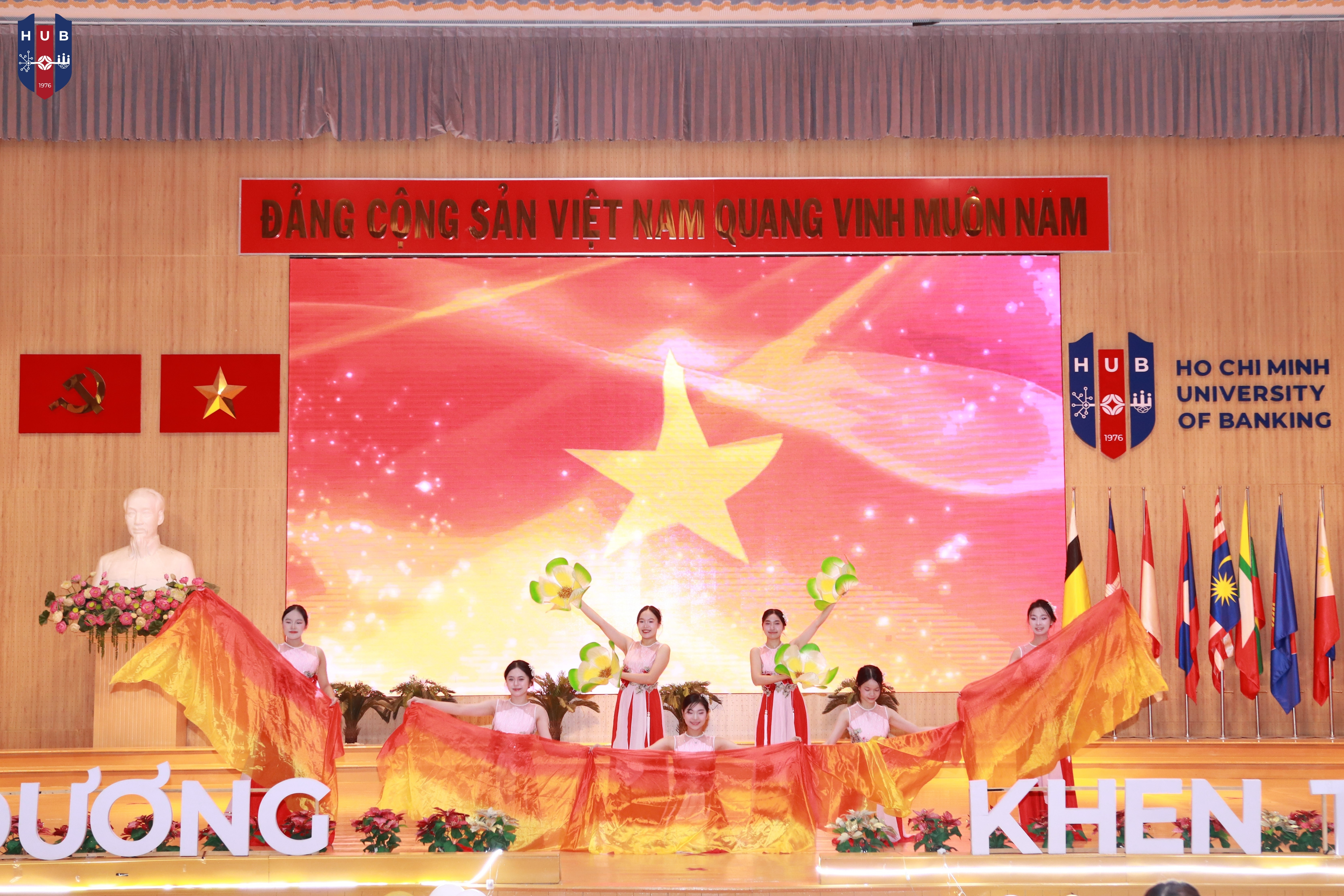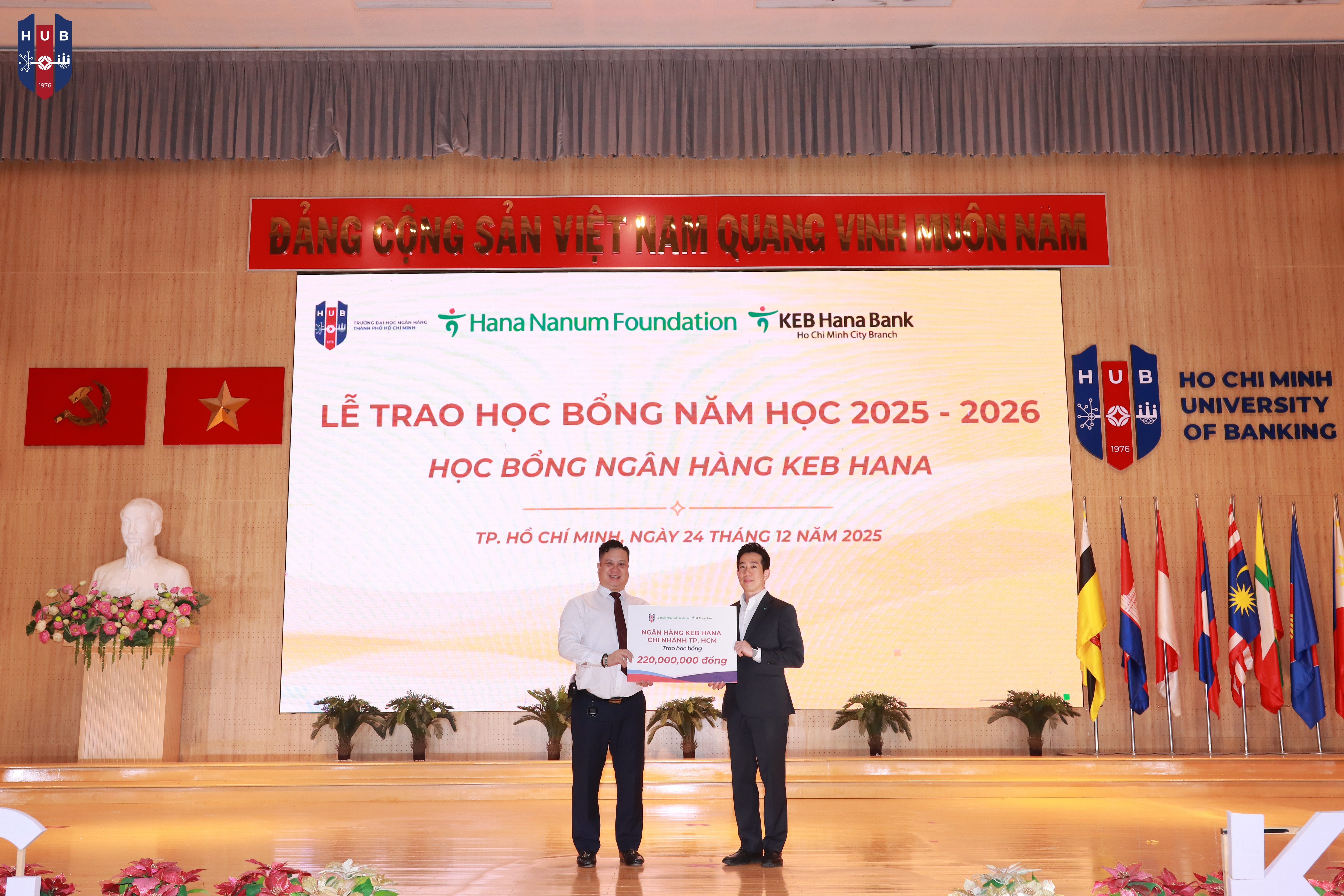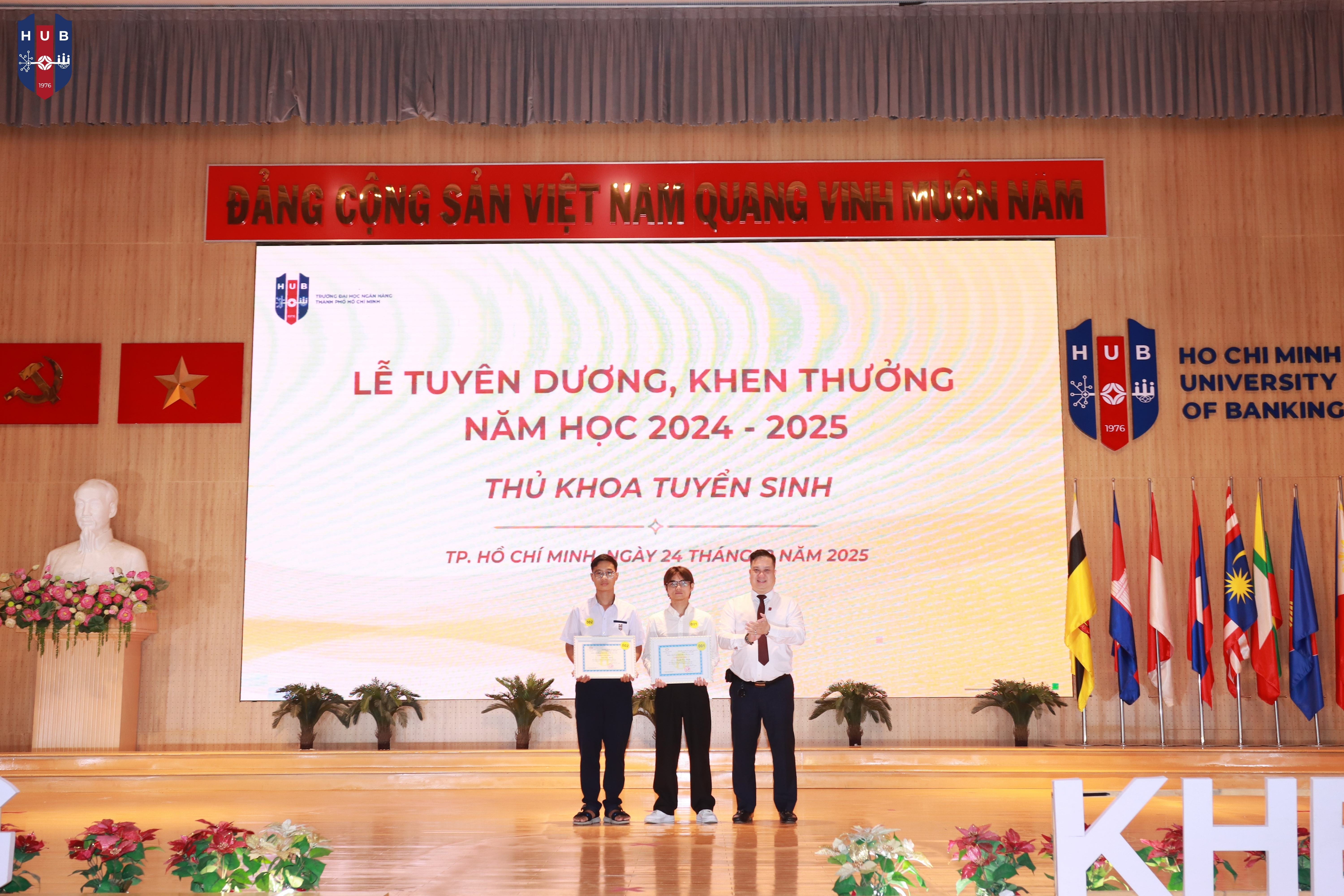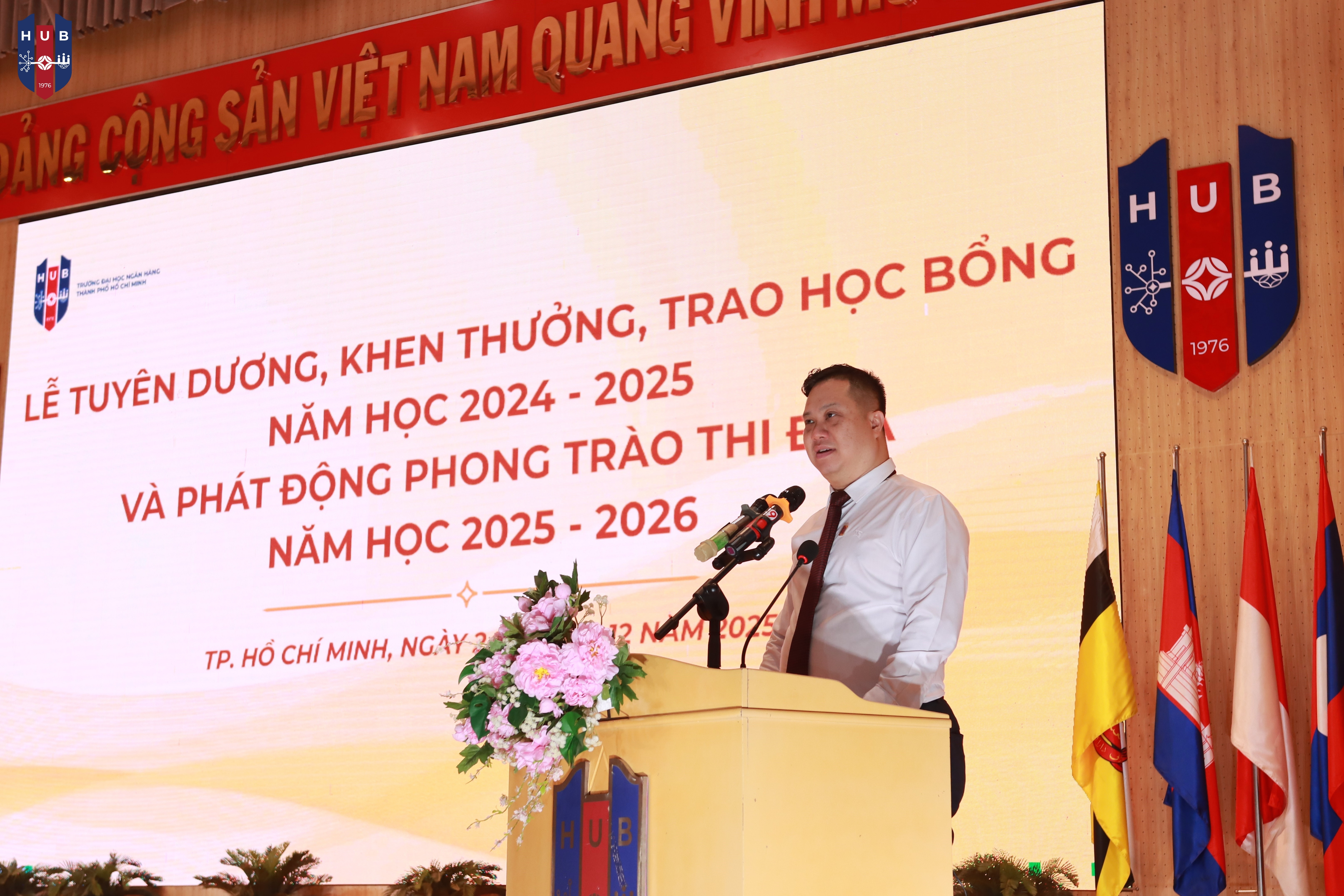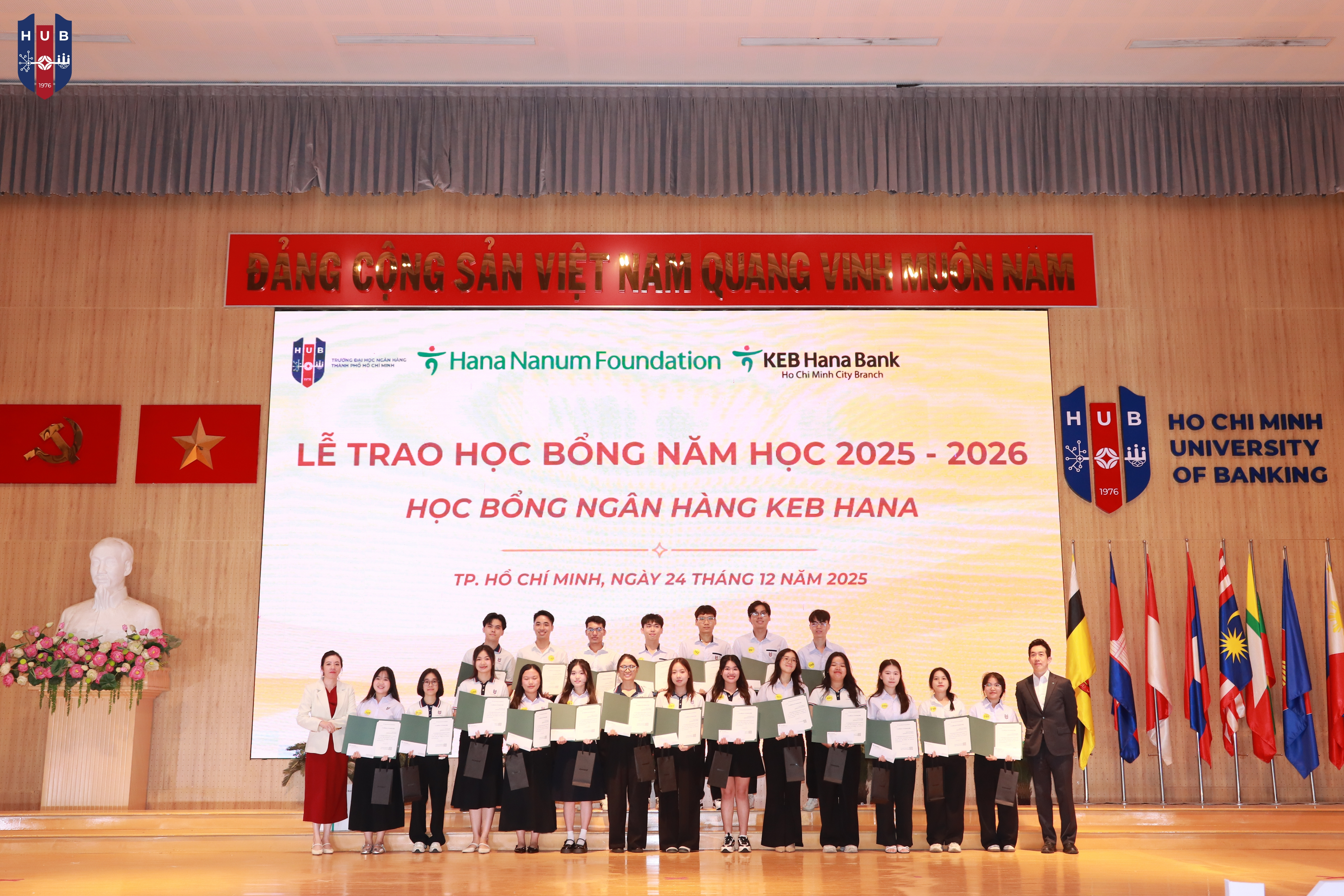Chiều ngày 24/12/2025, tại Hội trường lớn – Cơ sở Thủ Đức, Trường Đại học Ngân hàng TP. Hồ Chí Minh đã long trọng tổ chức Lễ tuyên dương, khen thưởng, trao học bổng năm học 2024 – 2025 và phát động phong trào thi đua năm học 2025 – 2026. Buổi lễ nhằm tổng kết, ghi nhận và vinh danh những tập thể, cá nhân sinh viên có thành tích xuất sắc trong học tập, rèn luyện và hoạt động phong trào trong năm học vừa qua.